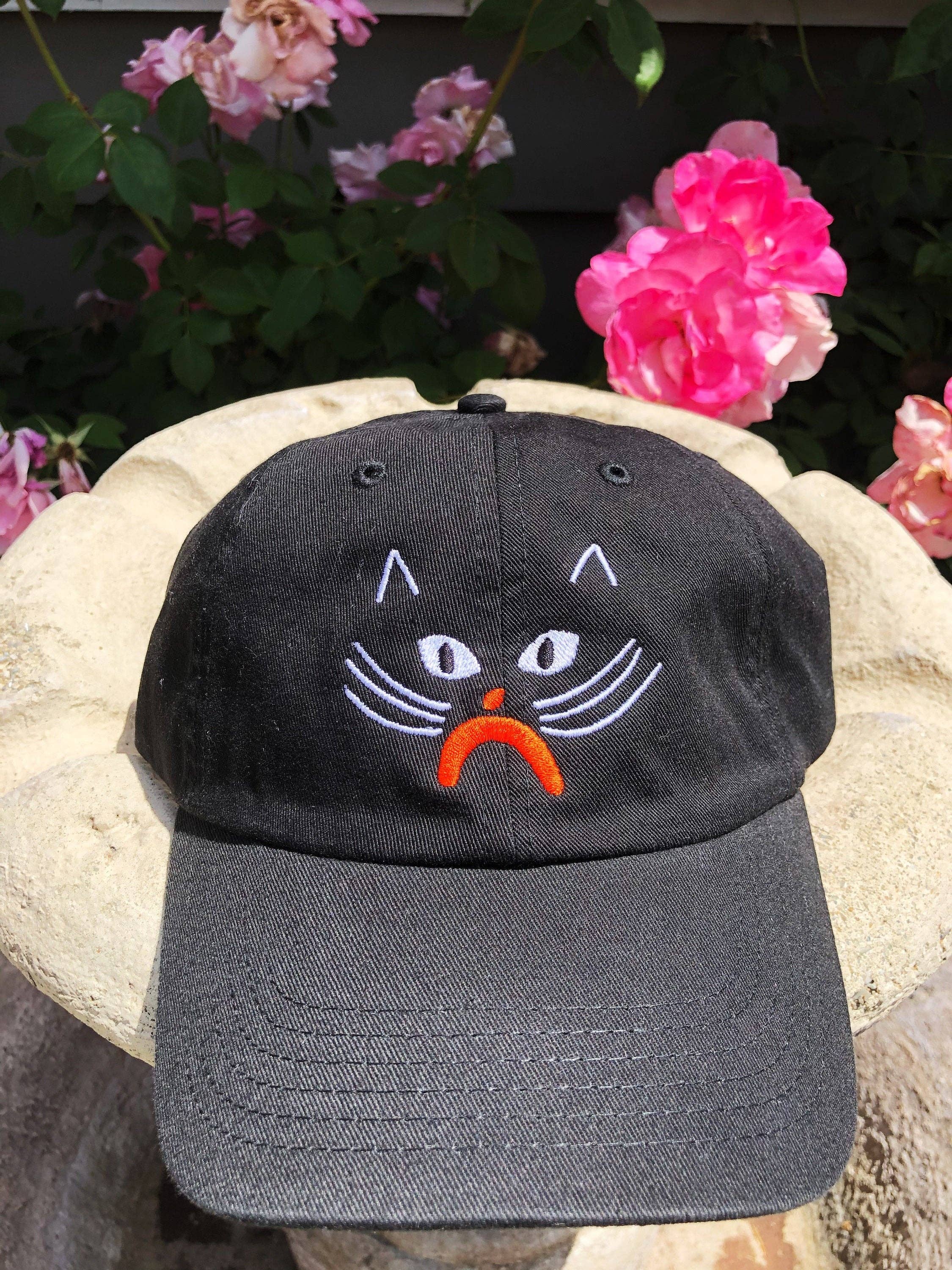 A grumpy cat face embroidered on a black dad hat, with a adjustable strap in back Perfect for somebody who needs a pick me up, or anyone with a head.