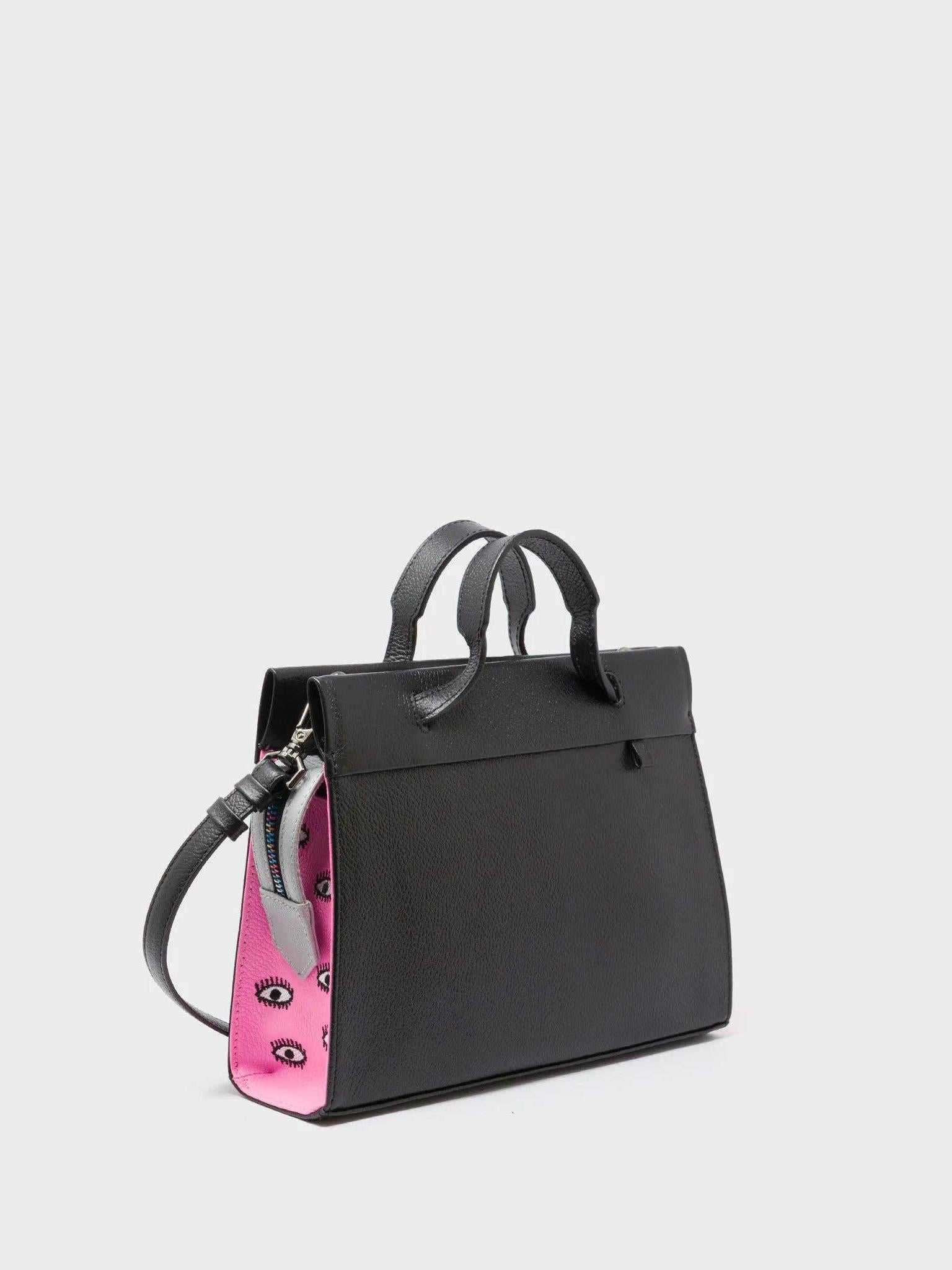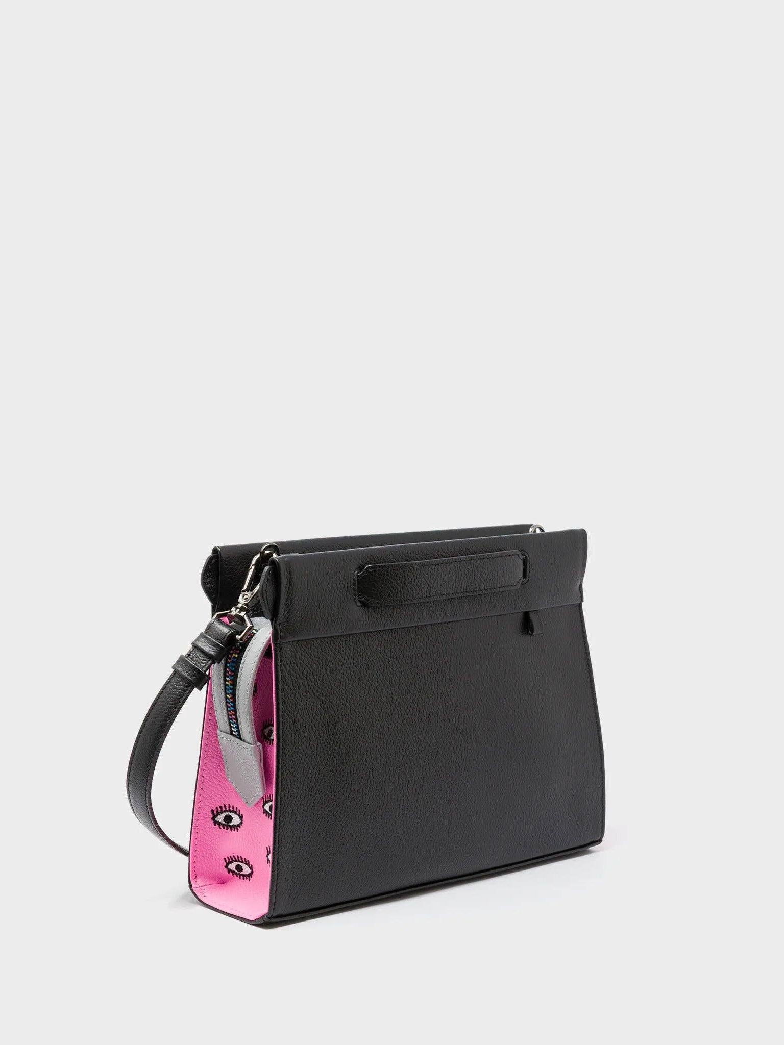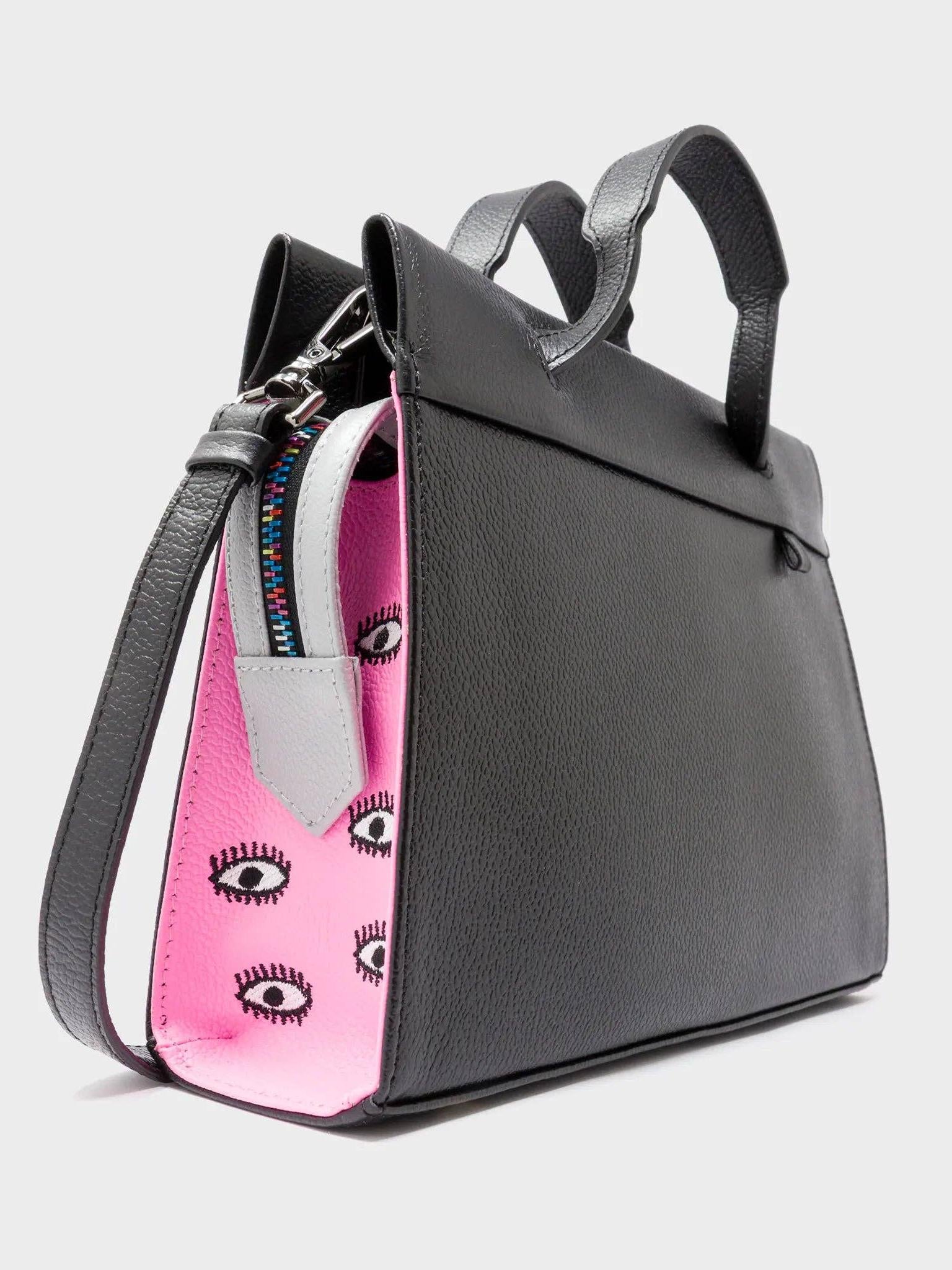 This sassy bag is black leather with sides that are a bubblegum pink (with all over eyes embroidered on). Wear Vali four ways: *With handles in as a clutch *With handles out as a handbag *With its matching crossbody strap *Or personalized with a charm or strap!