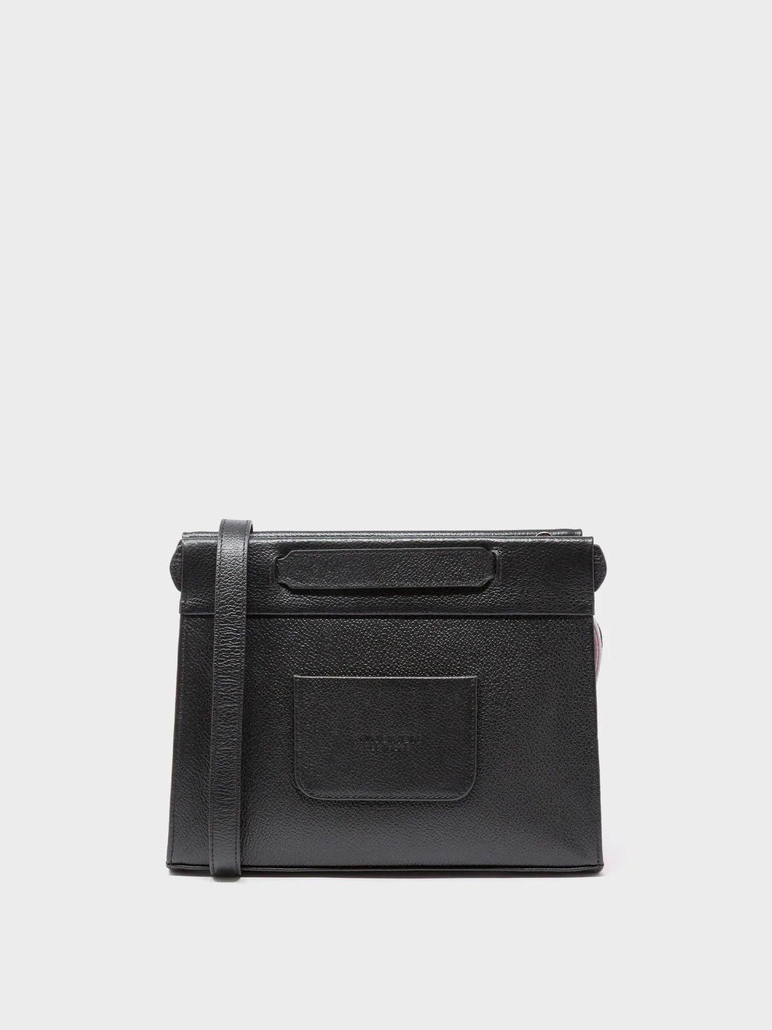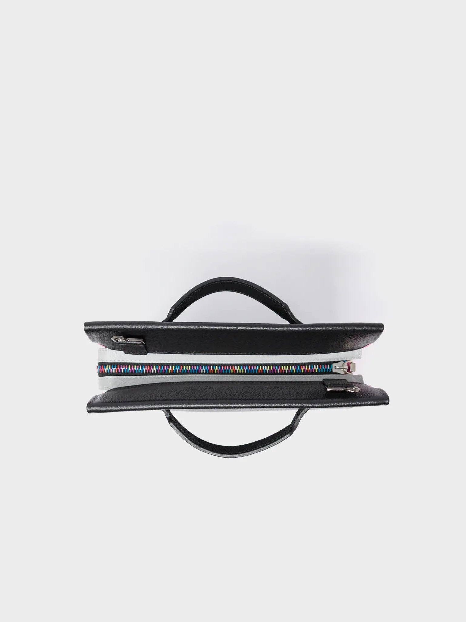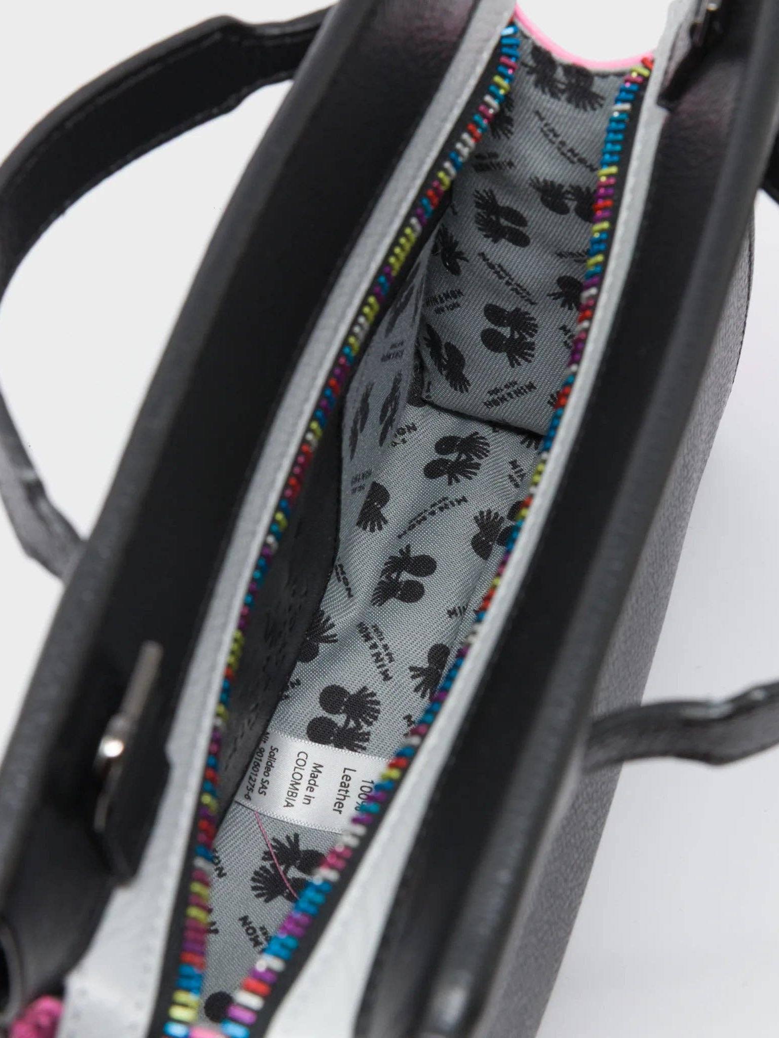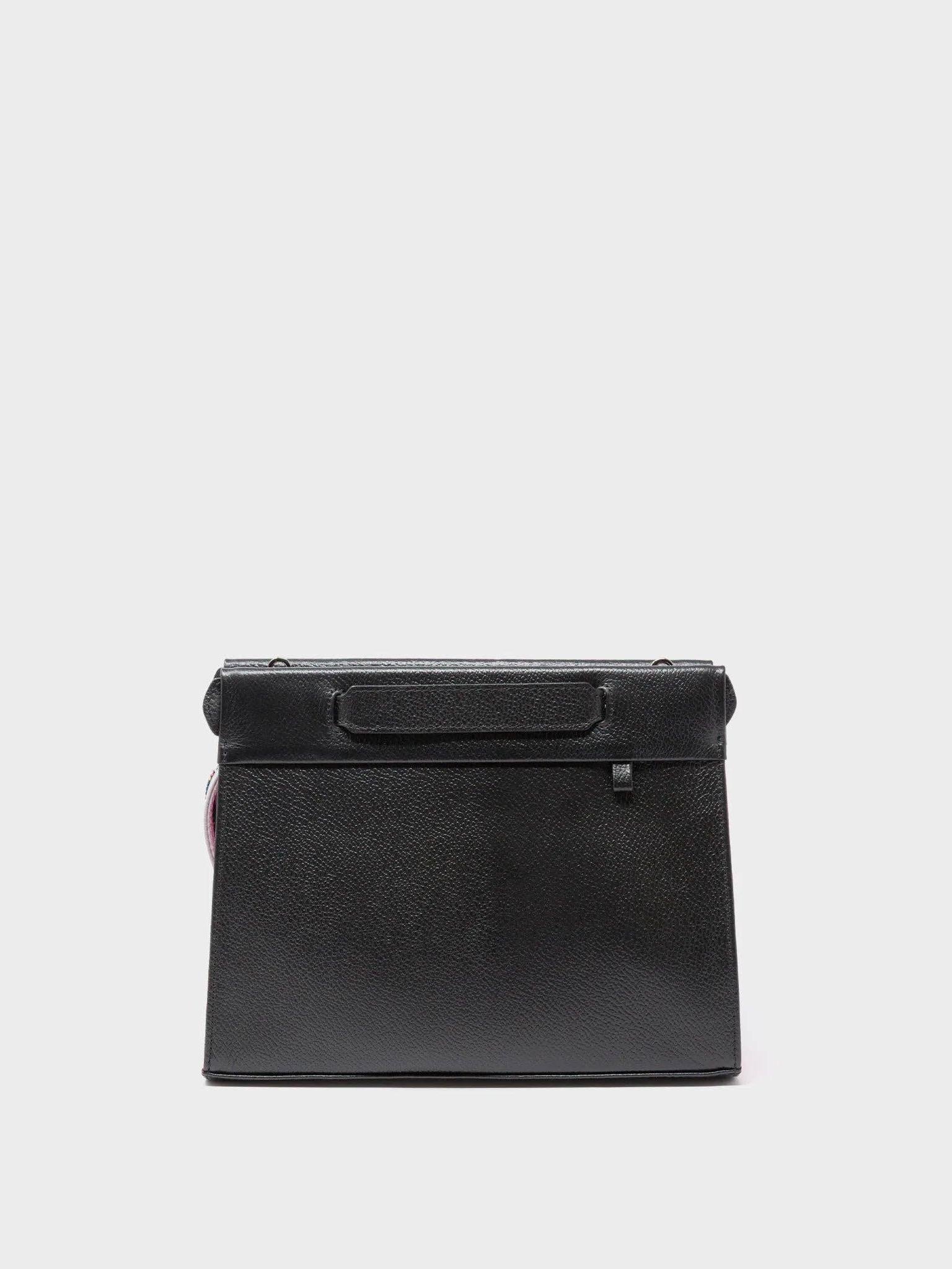 This sassy bag is black leather with sides that are a bubblegum pink (with all over eyes embroidered on). Wear Vali four ways: *With handles in as a clutch *With handles out as a handbag *With its matching crossbody strap *Or personalized with a charm or strap!