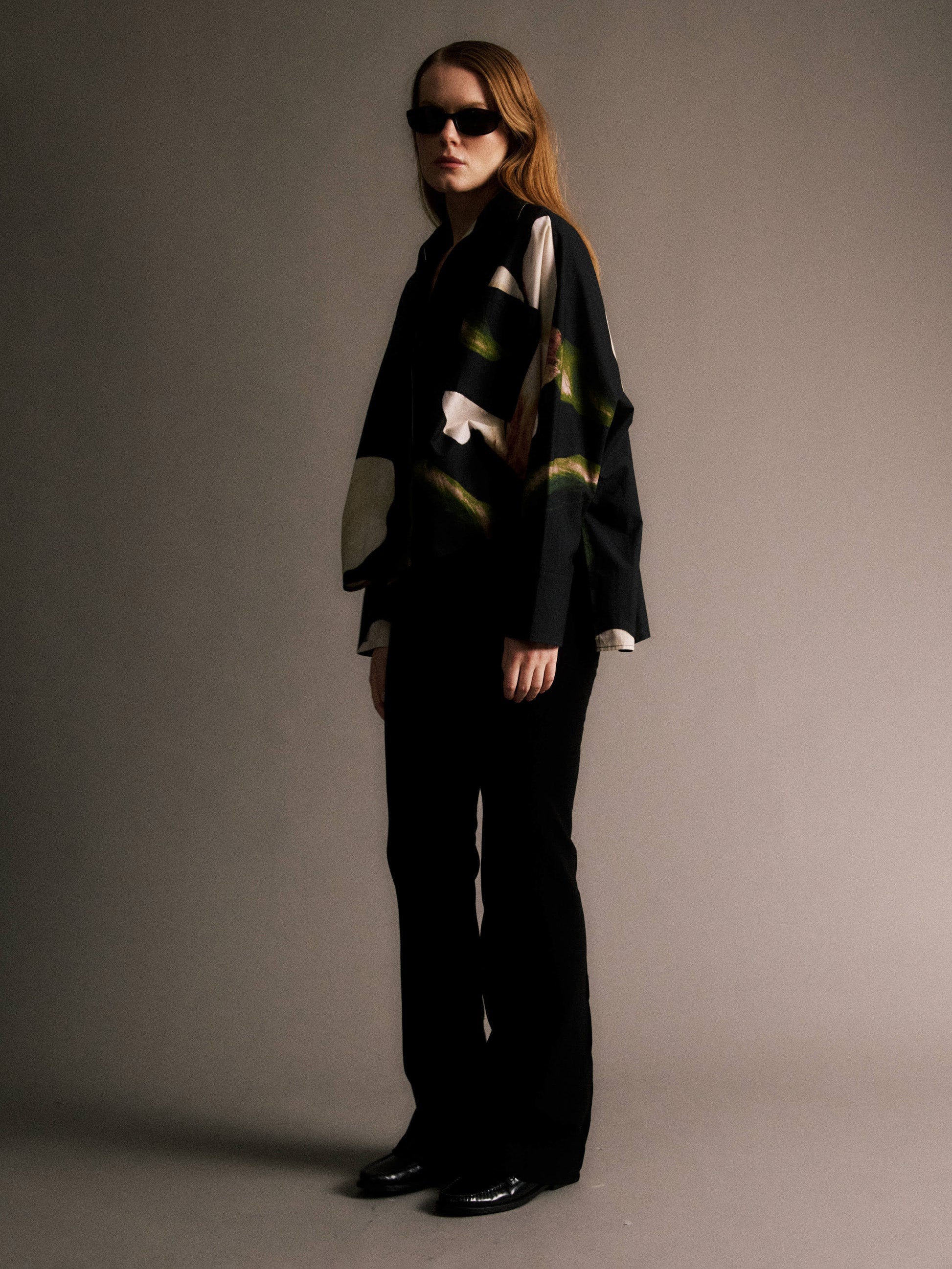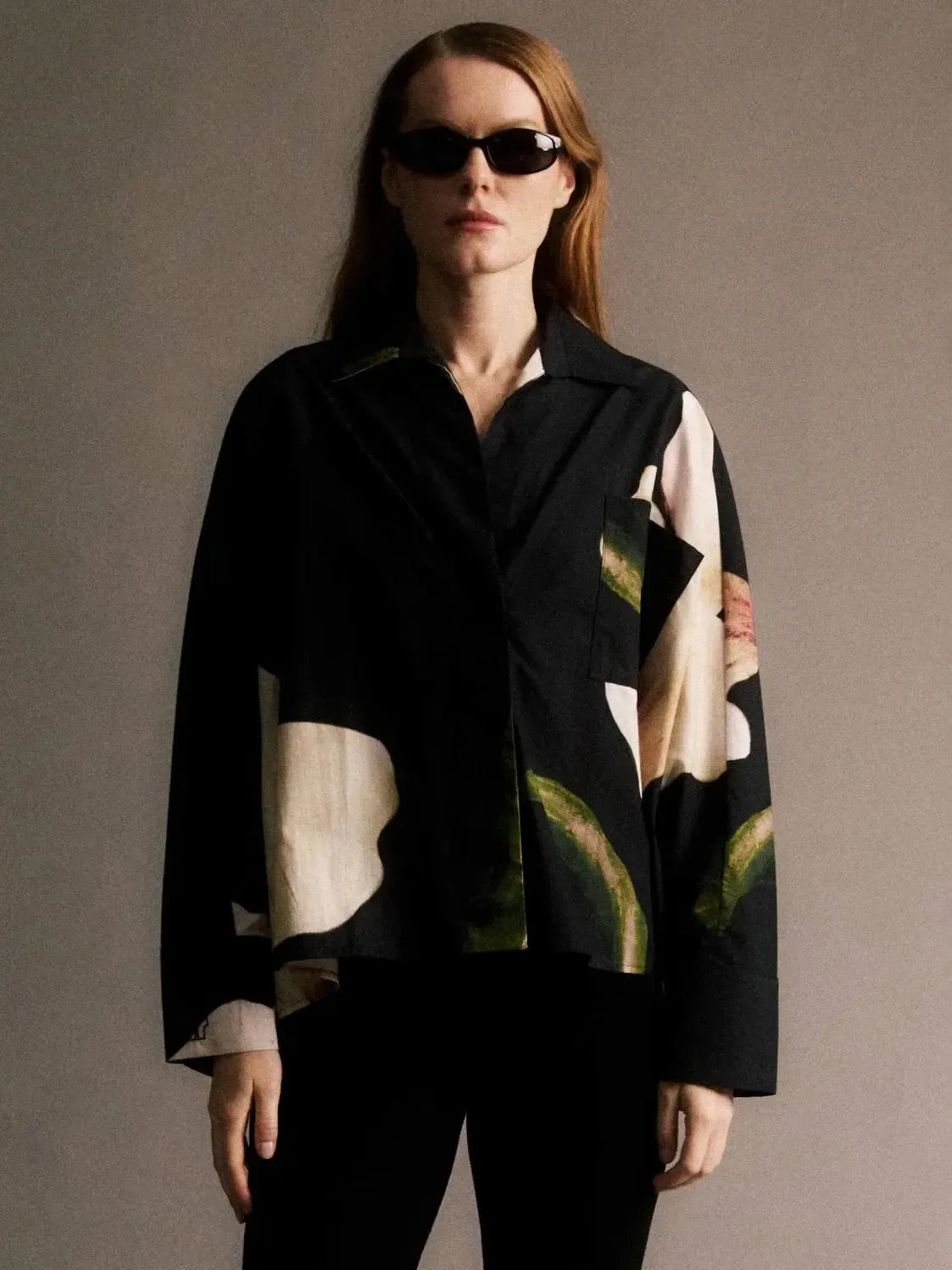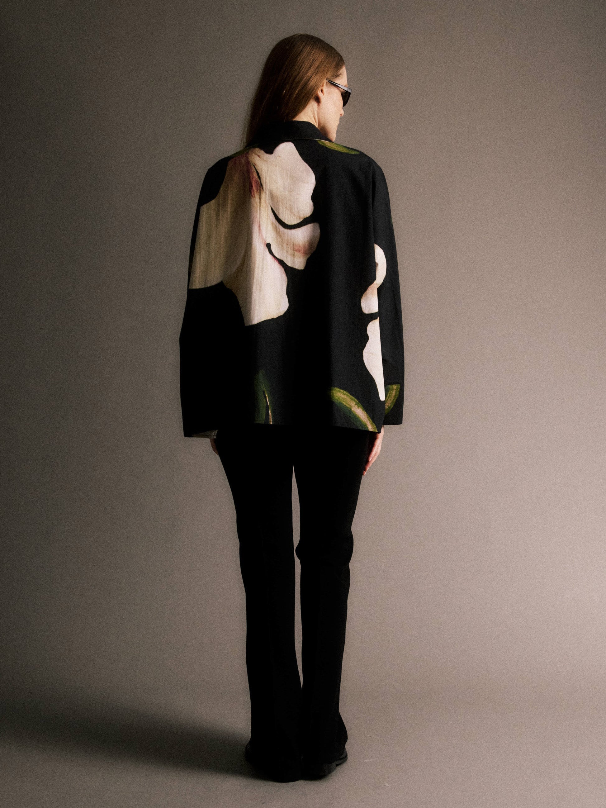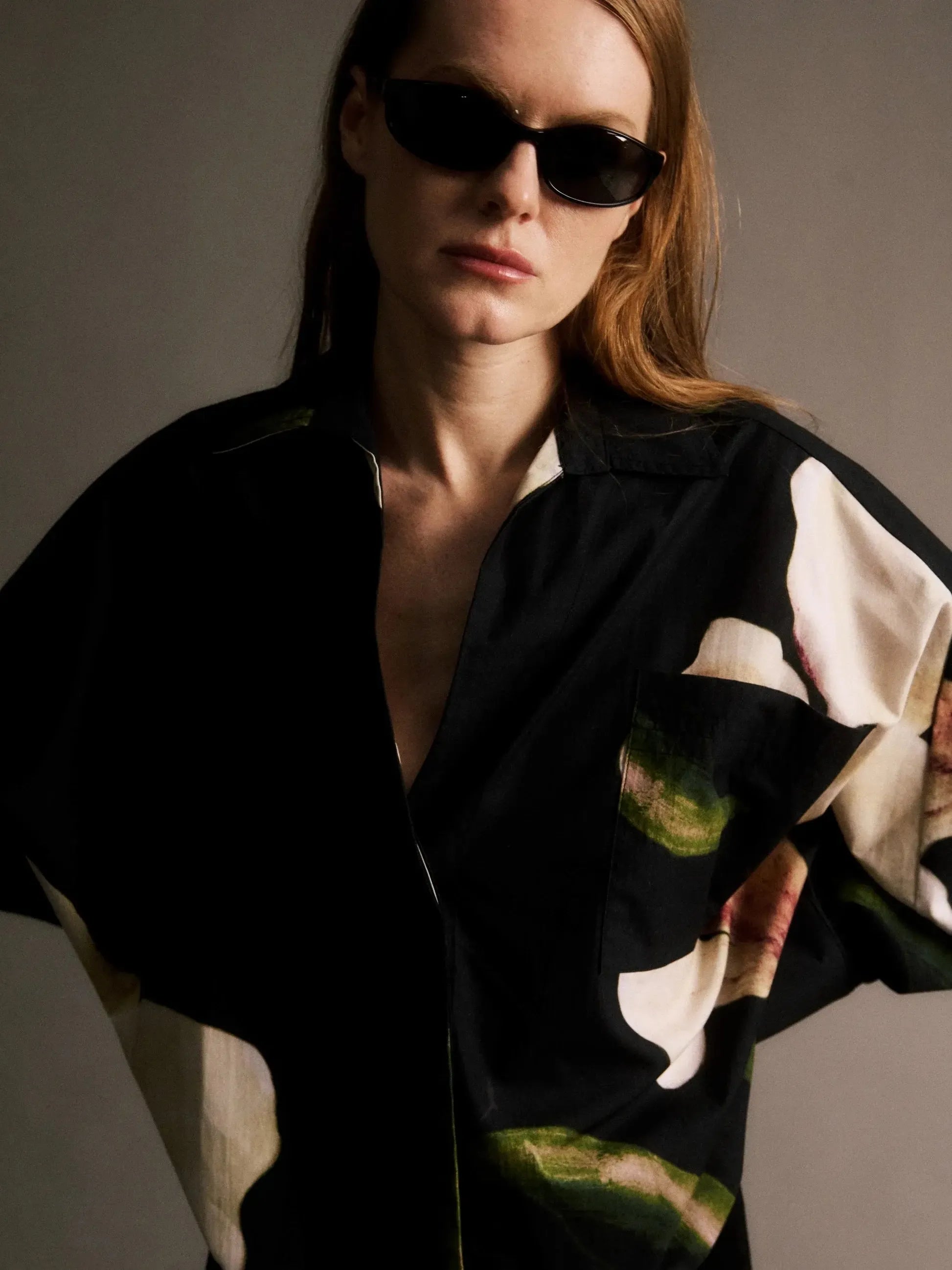 This playful black shirt boasts a relaxed oversized fit, featuring an exclusive JIJI Studio floral print all over, dropped sleeves, and a patch pocket on the chest.