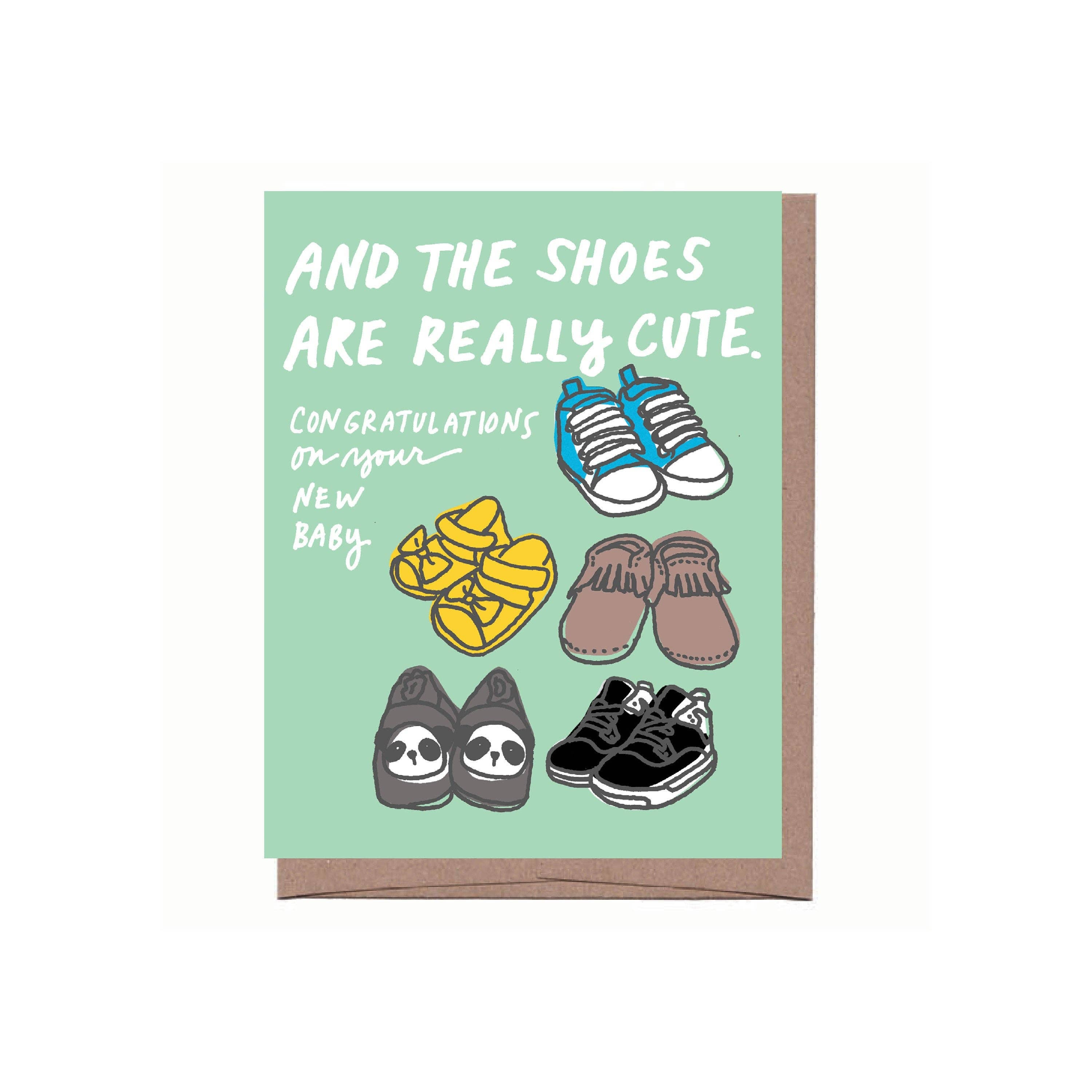 The shoes are really cute. Flat printed on FSC certified paper from an original handcut collage, drawing, or print. 4.25" x 5.5" folded card with recycled kraft envelope. Blank inside Made in USA