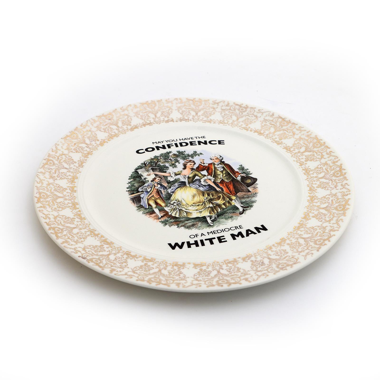 ASSORTED STYLES OF VINTAGE ROMANTIC COLONIAL SALAD PLATES 1 each of Assorted 7.5" plates with Text pictured (Confidence of a Mediocre White Man). Each plate has a 23 Karat Gold design on the rim of the plate LennyMud will select from 2 different styles of fine china that has been professionally restored and altered. Price is for one plate. All item are food safe. Hand wash Recommended.