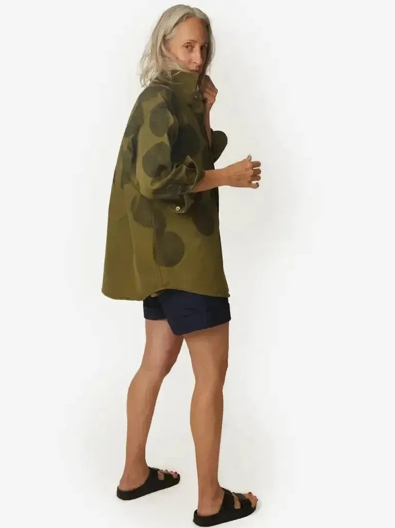 The Oz is an oversized shacket with our fit tweaks. The body is 90s oversized, with dropped shoulders and roomy, bracelet length sleeves. Side seam pockets at the hem and two front chest pockets, with deep pleats at back yoke and at the cuffs.