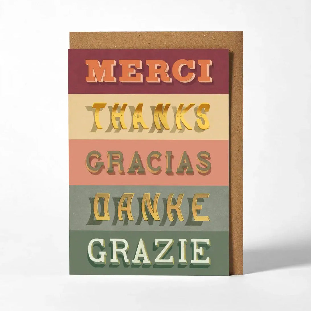 Show your appreciation in style with this elegant greetings card, featuring the word "Thanks" in five languages, beautifully rendered in vintage-inspired typographic lettering. A thoughtful way to express gratitude, this card is perfect for any occasion where you want to say thank you.