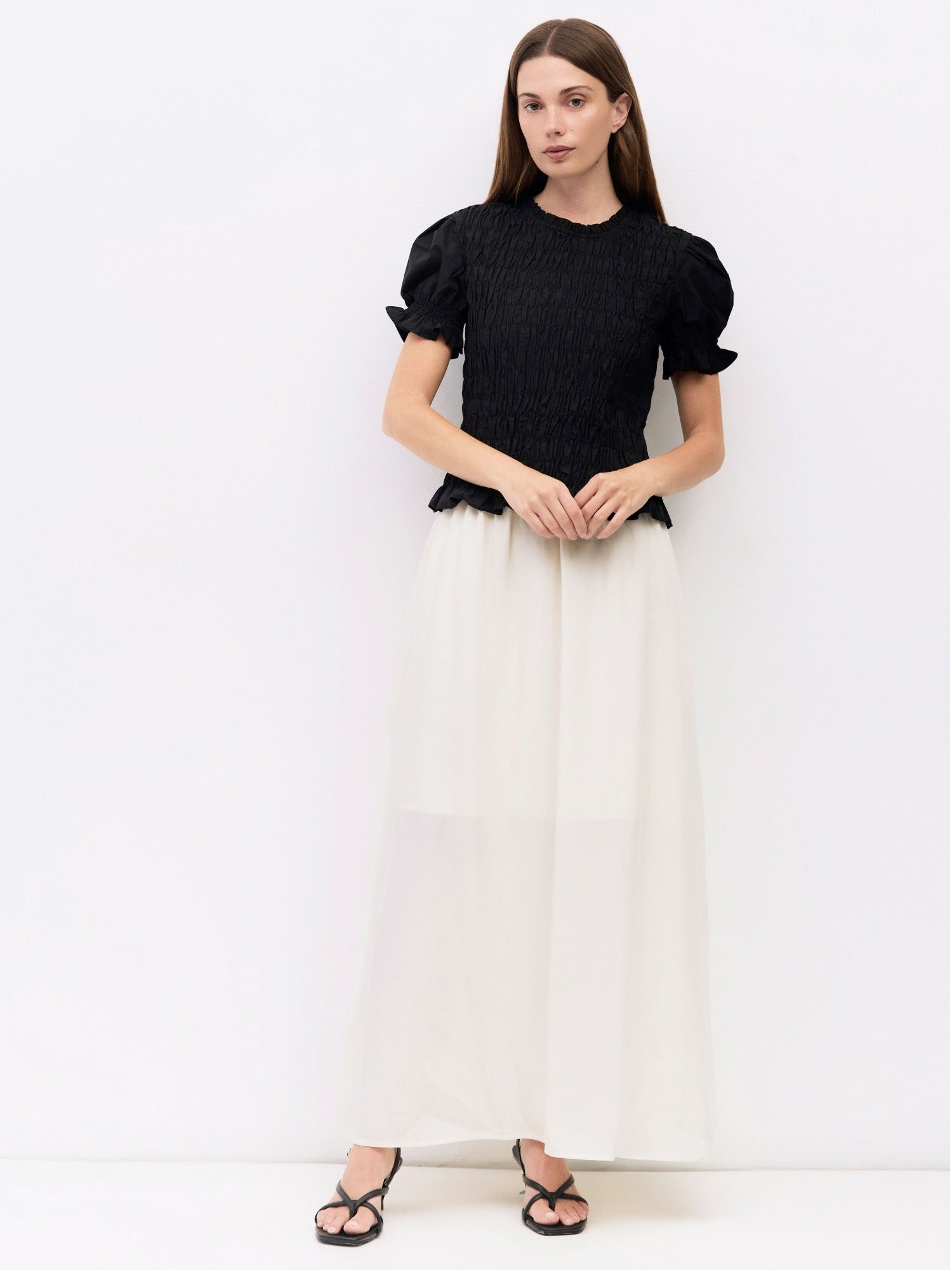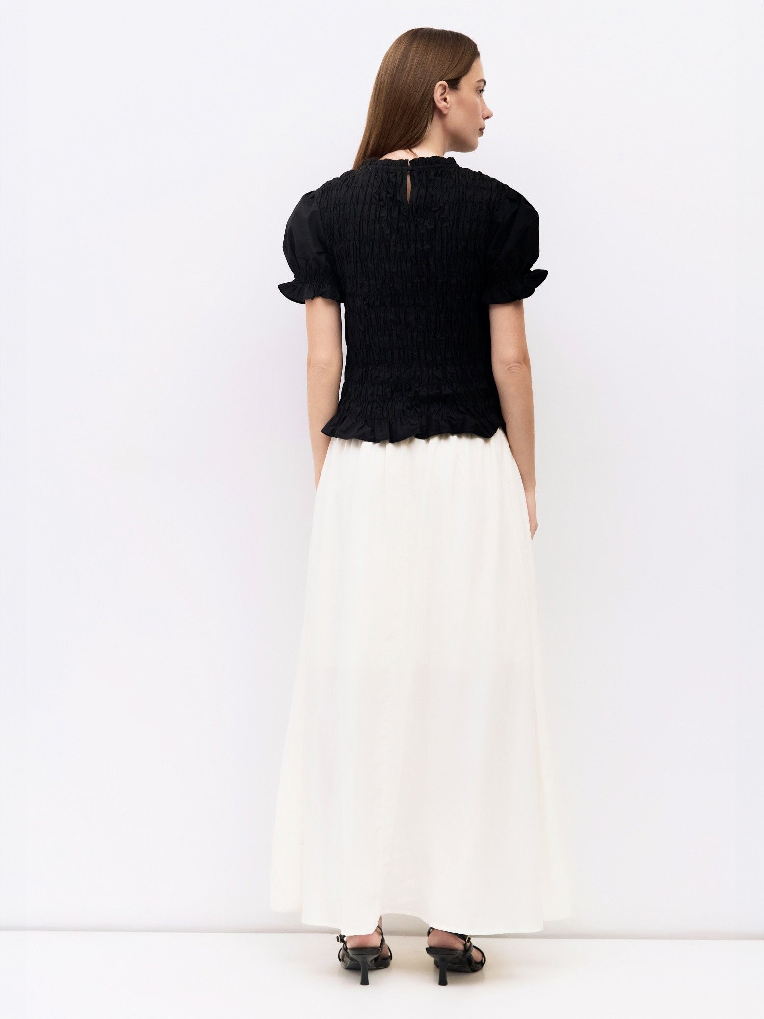 The Bristol Top is a form-fitting blouse made from smocked midweight cotton with puff sleeves. It features ruffled details along the cuffs, neck, and hem, plus a crewneck and back keyhole button closure. A delicate and structured blouse with subtle texture.