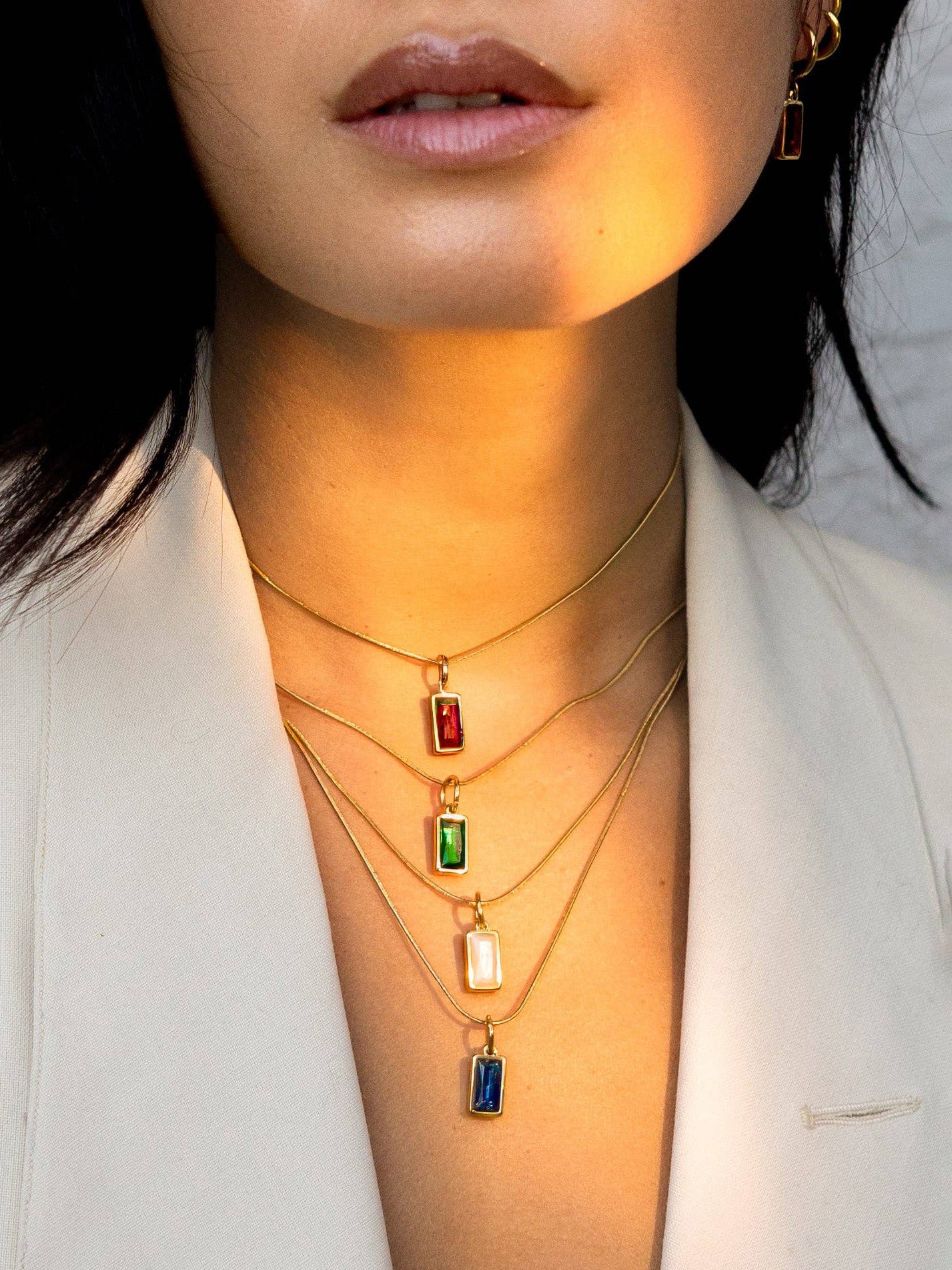 A classic necklace with a bit of sparkle, rectangular cut stone on dainty 18K gold plated chain.