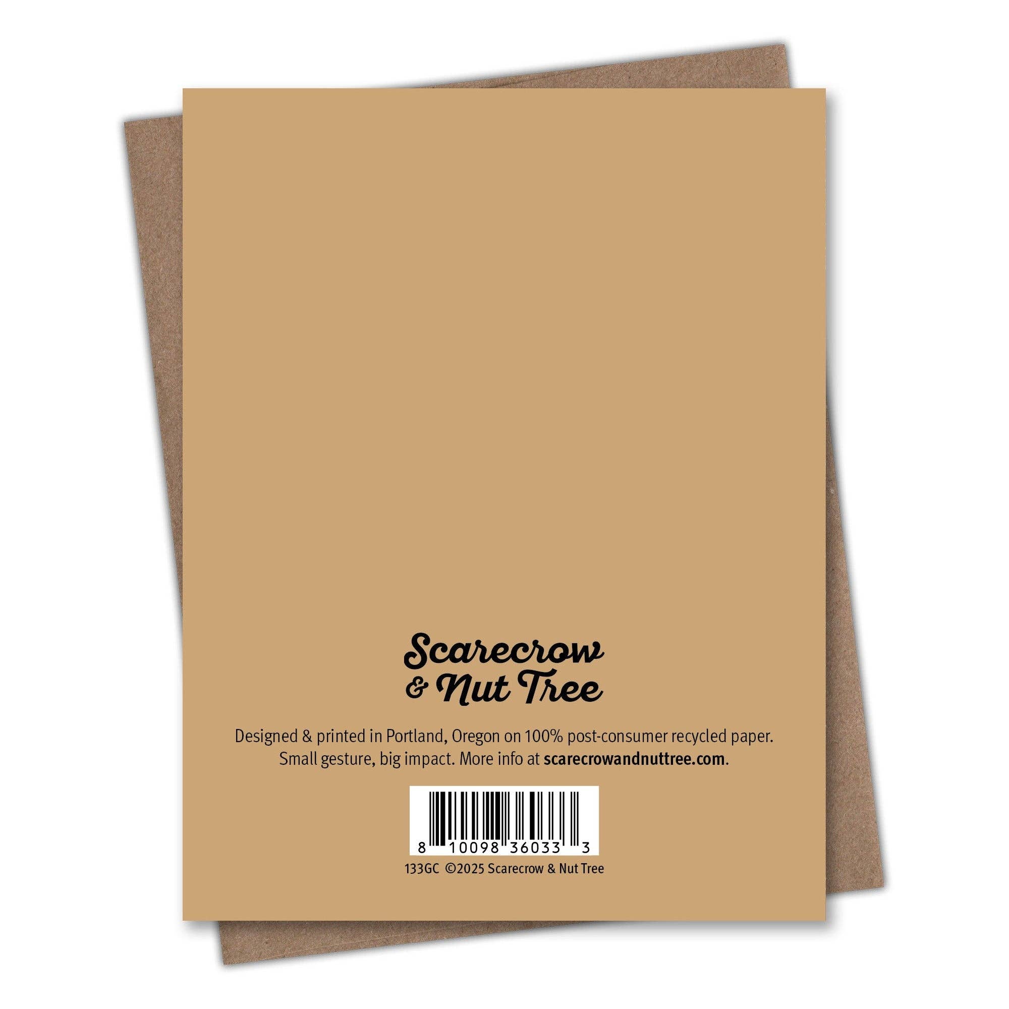 This Birthday card is printed on 100% recycled paper because we love trees as much as we love helping you connect. All Scarecrow & Nut Tree greeting cards are blank inside, which means you can write whatever you want. We’re partial to something personal, playful, or punny. But you do you. Comes with a recycled Kraft envelope so the whole thing is easy on the eyes and the earth.