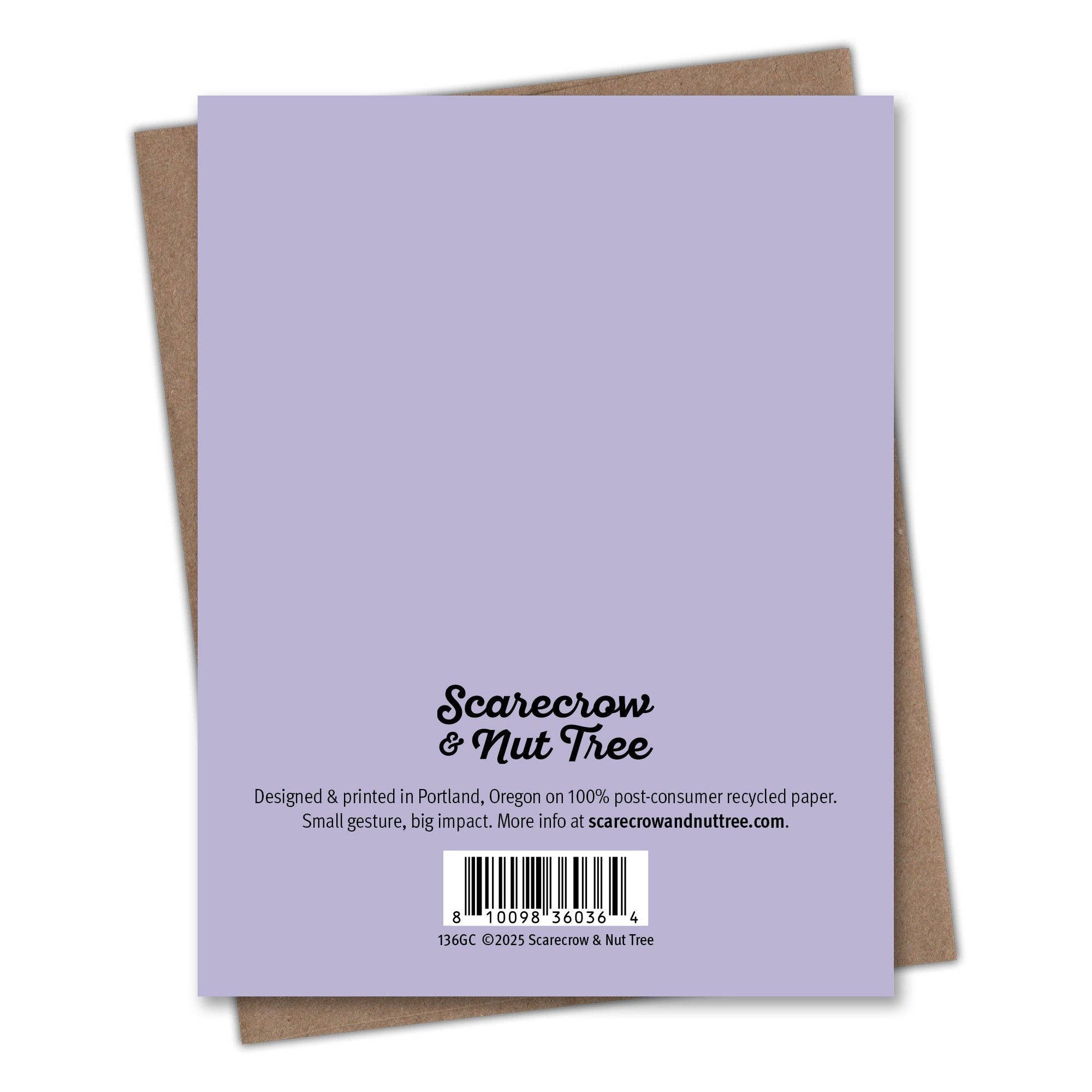 This Birthday card is printed on 100% recycled paper because we love trees as much as we love helping you connect. All Scarecrow & Nut Tree greeting cards are blank inside, which means you can write whatever you want. We’re partial to something personal, playful, or punny. But you do you. Comes with a recycled Kraft envelope so the whole thing is easy on the eyes and the earth.