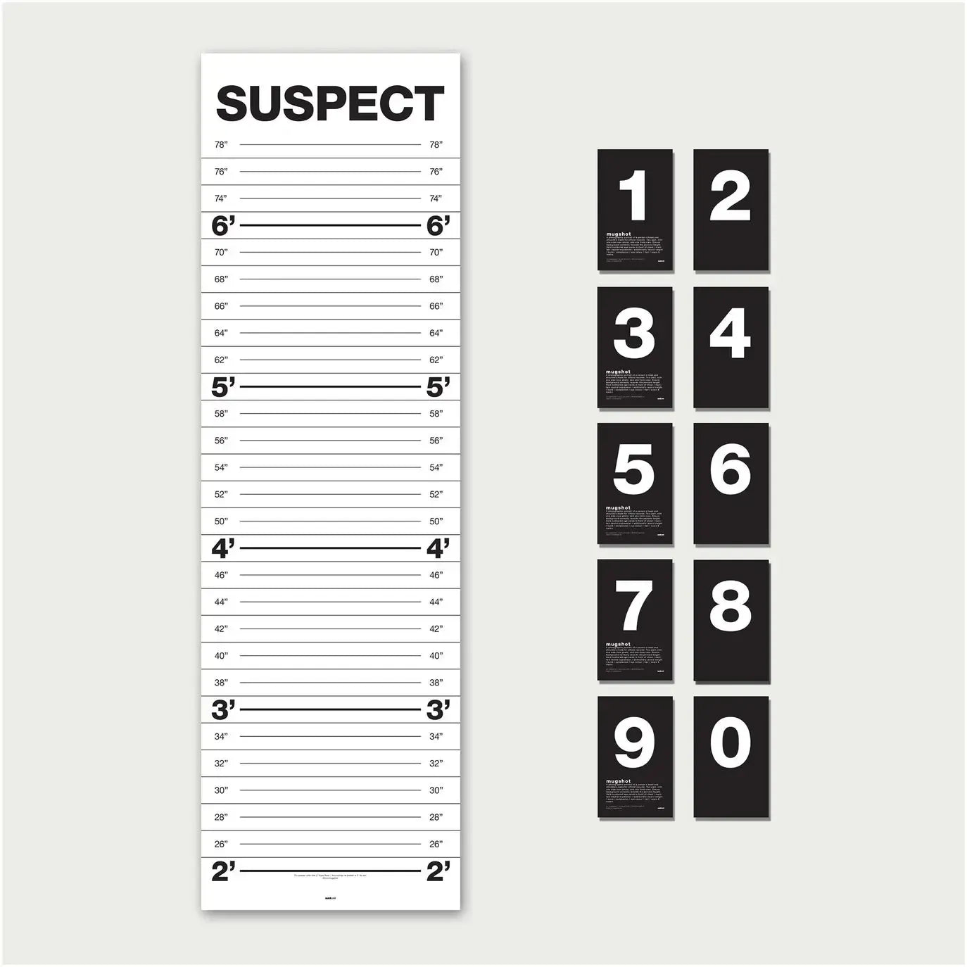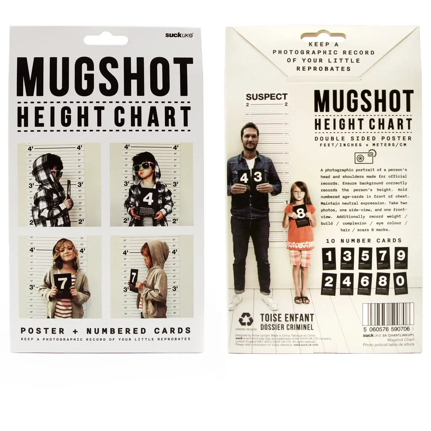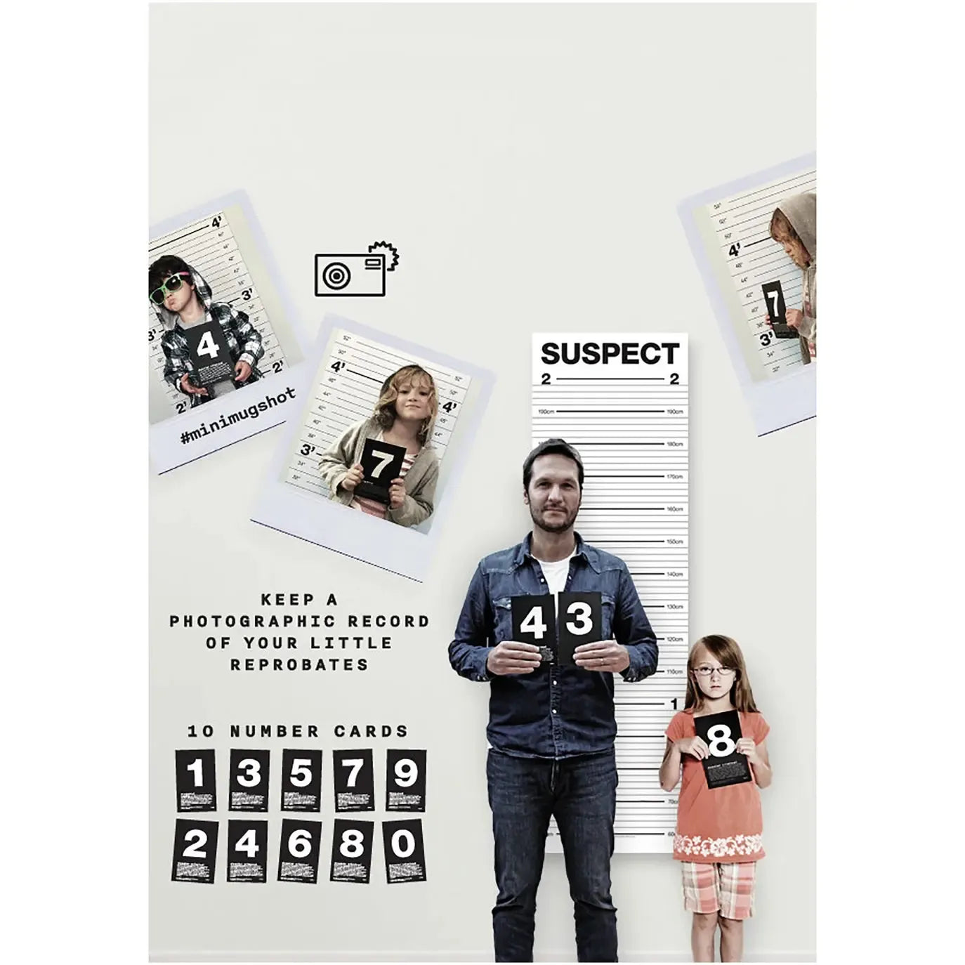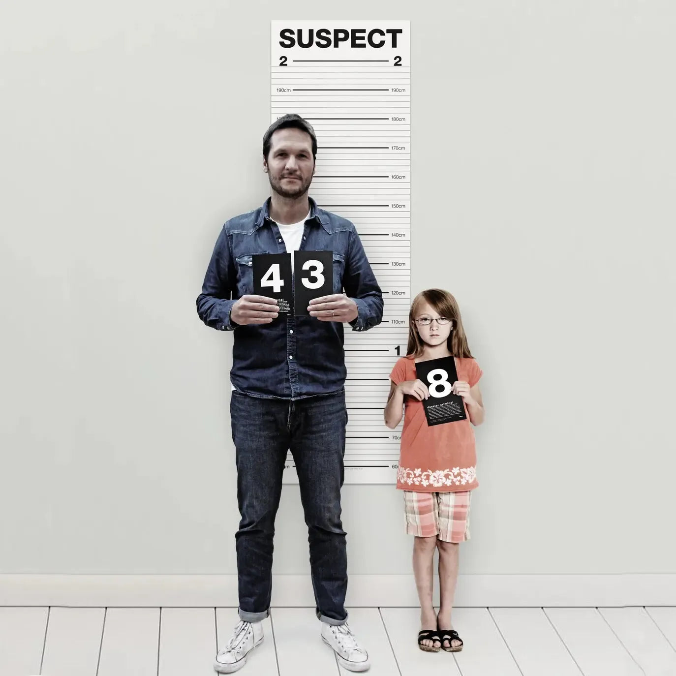 A double-sided paper poster with measurements in feet, inches, meters and cm's and set of 10 number cards. Perfect for parties, to add to a photo-booth, or as a wall chart for the whole family to record special moments and ages! Start by ensuring the poster correctly records the height, then ask the suspect to hold the numbered age cards in front of their chest. Take two photos, one front-view, one side-view, and you'll have an almost official criminal record to add to the photo album.