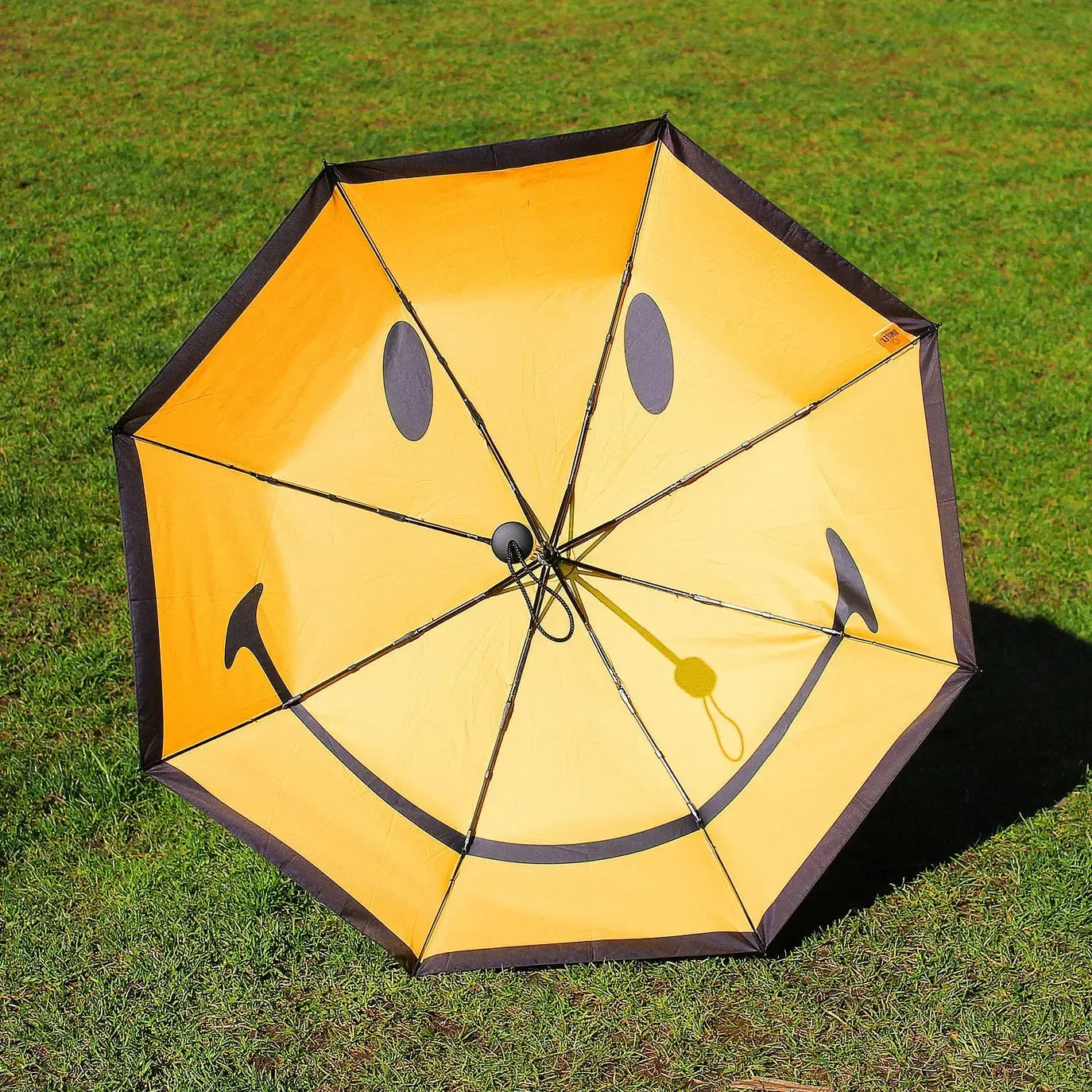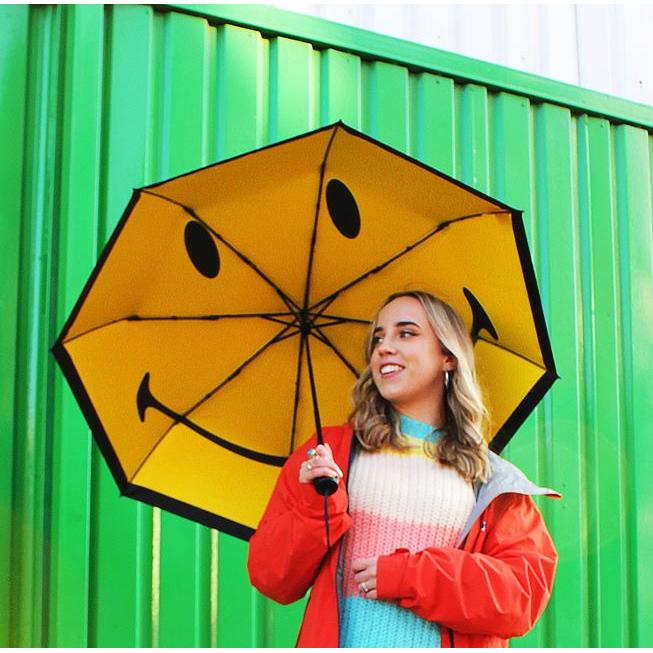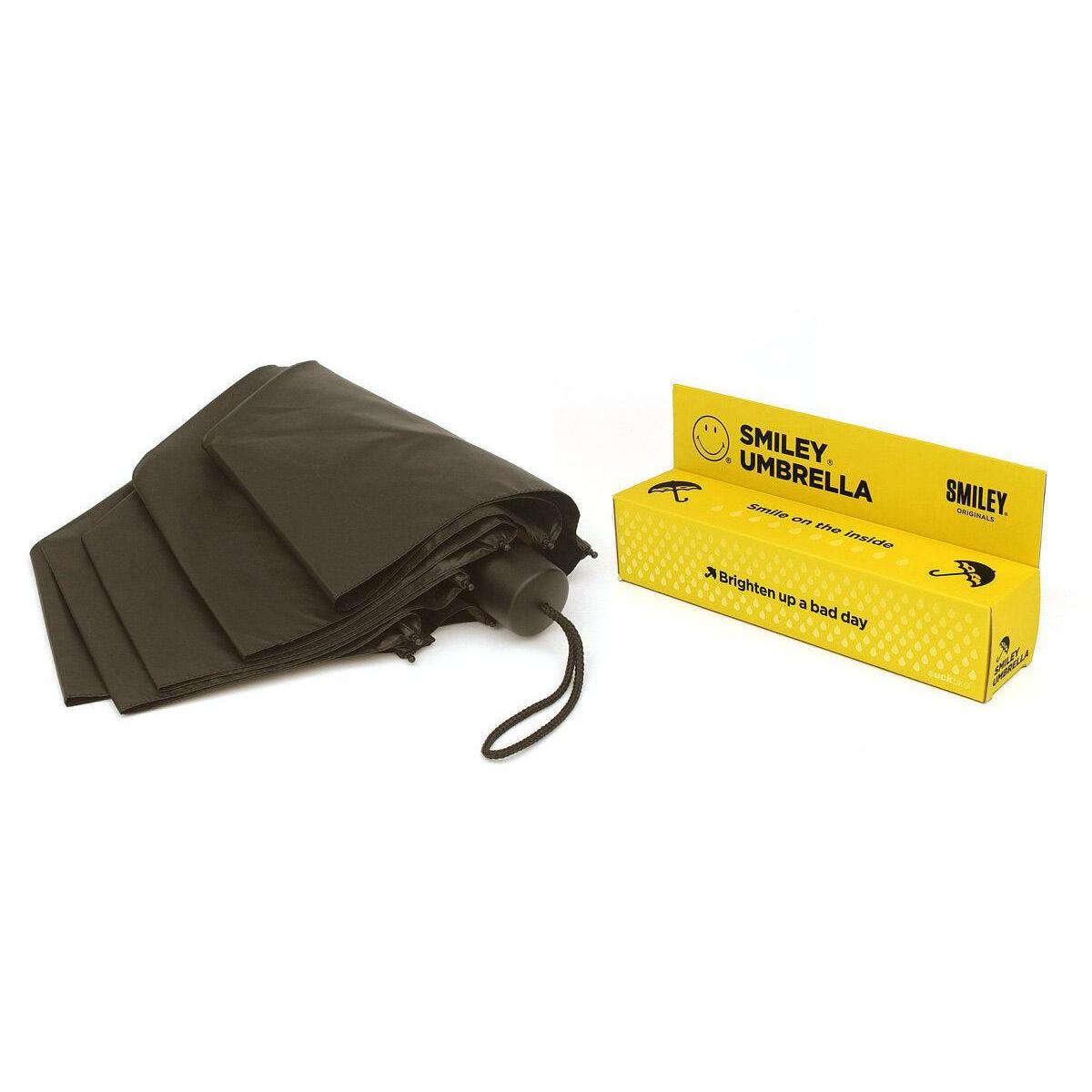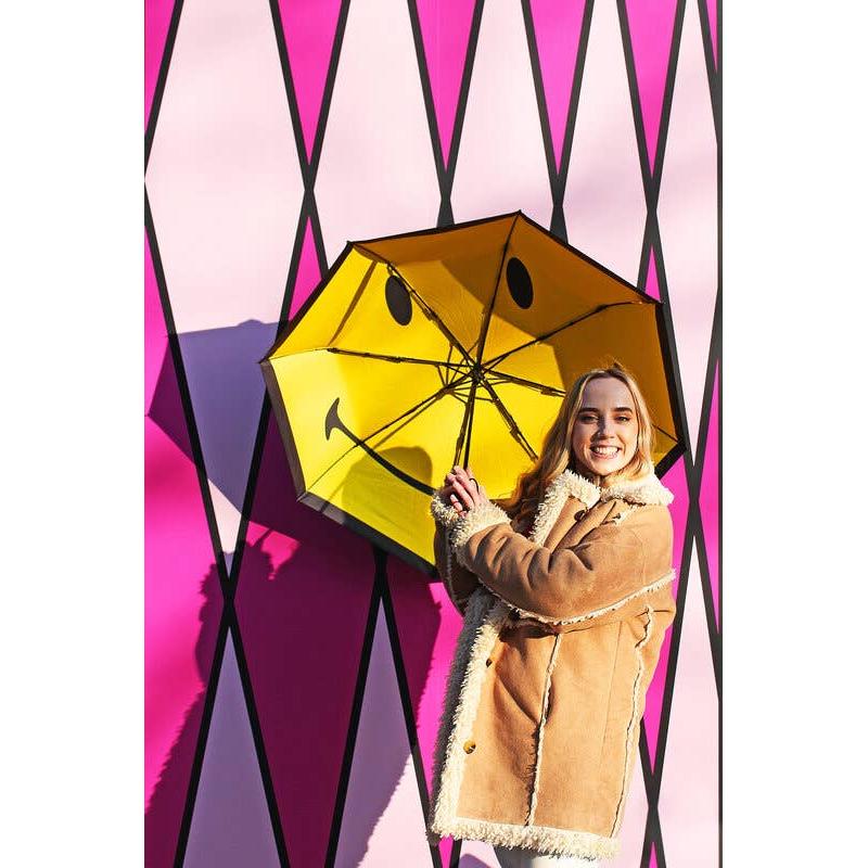 The happiest umbrella the rain has ever seen. This Smiley® Umbrella is here to remind you that a little shower doesn't have to ruin your day. With a carbon fibre design, this happy face defies even the windiest weather. Plain and inconspicuous from the outside, the lightweight classic black folding brolly opens up to reveal a bit of joy on a rainy day. Designed and made by Suck UK