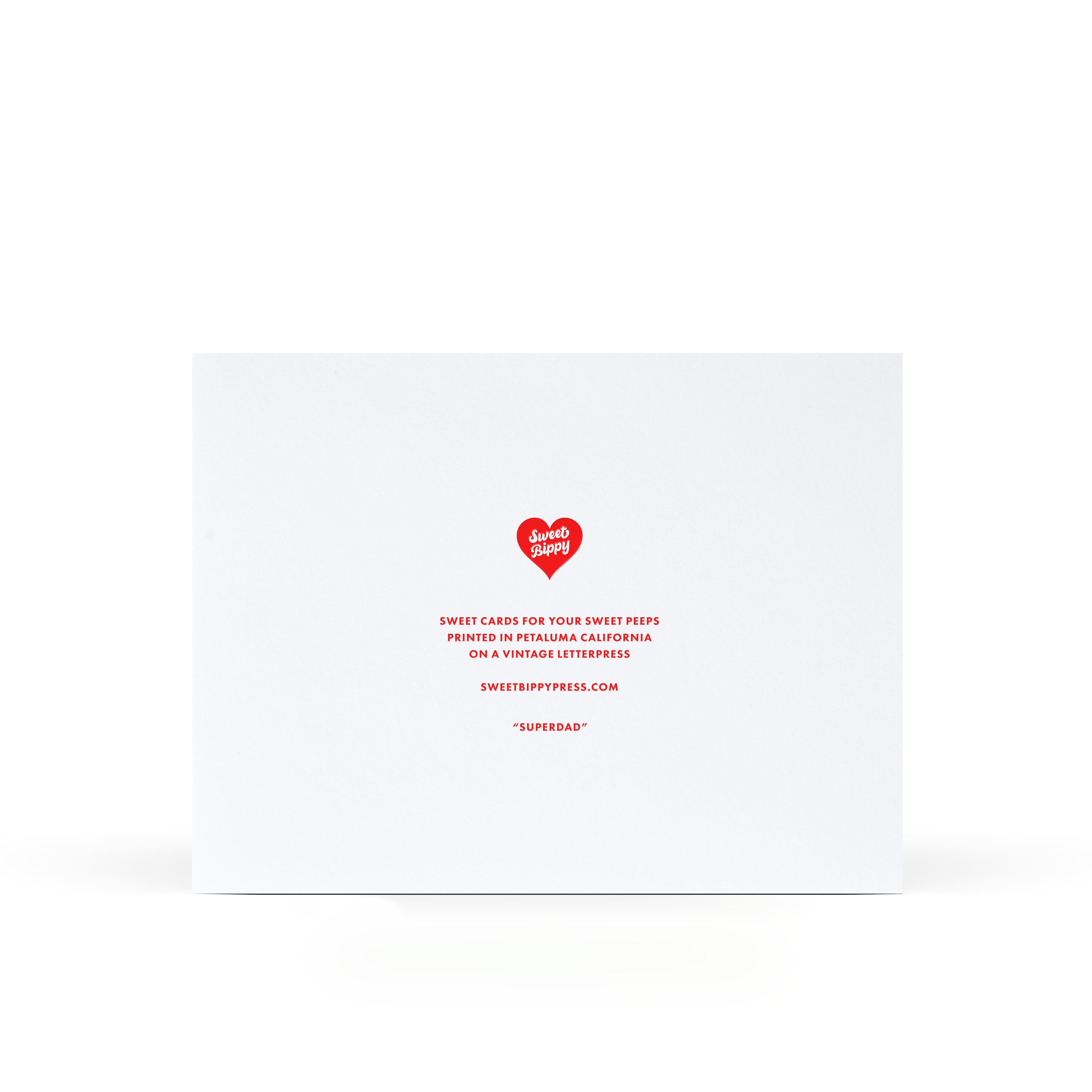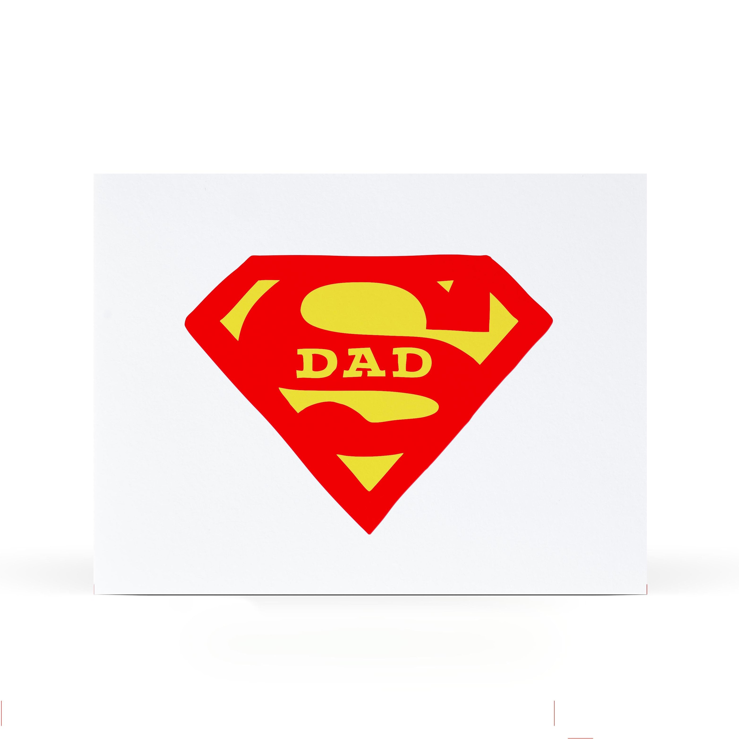 Is your dad a superhero in disguise? Show him he's your champion with this bold and playful letterpress Father's Day card. Featuring a striking "S" emblem cleverly redesigned to read "DAD," this card packs a punch of retro comic book style. Printed with vibrant neon red and sunny yellow inks, the design leaps off the luxurious, tactile paper thanks to the deep impression of the letterpress technique. This isn't just a card; it's a little piece of art that celebrates the super dad in your life. Blank inside, it offers plenty of space for you to write a truly heroic message of your own.