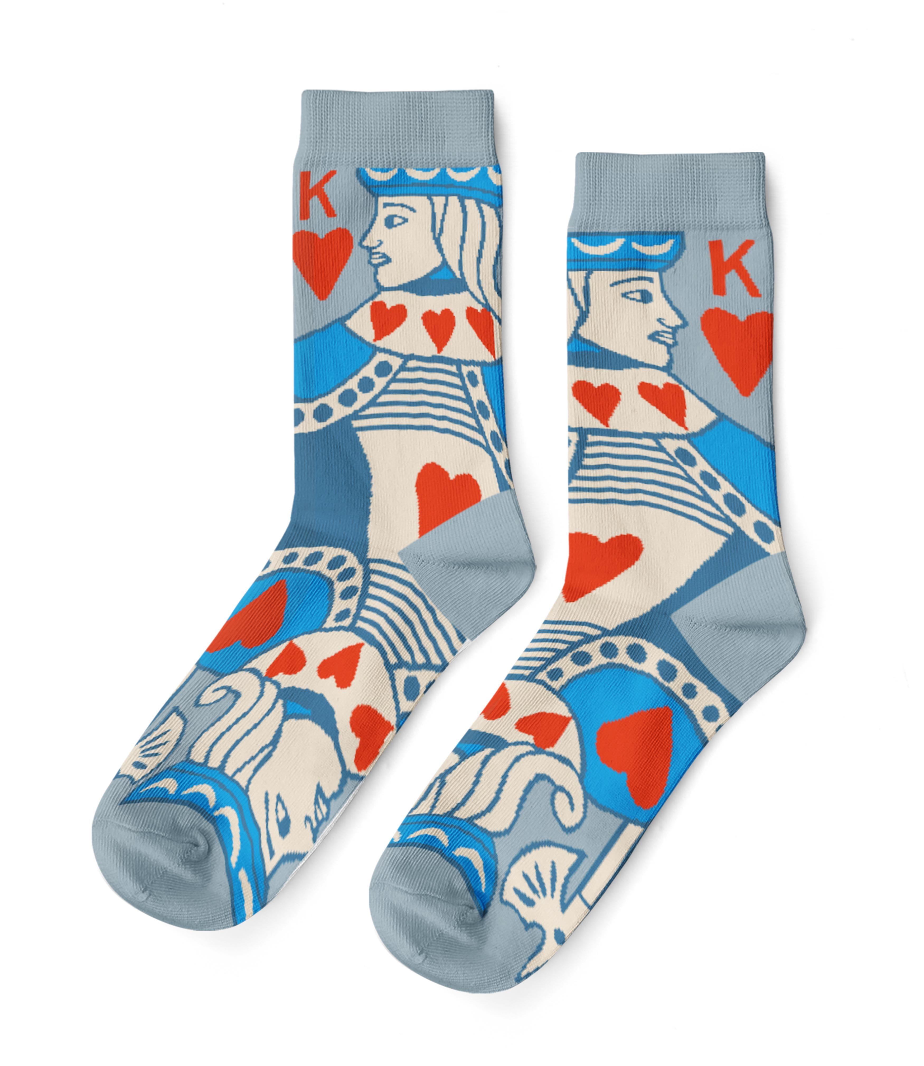 The King of Hearts Socks put a bold, graphic twist on a classic playing card motif. Rendered in cool blues with pops of red, the design wraps the iconic king and heart symbols around the sock in a way that feels modern, playful, and just a little mischievous. Equal parts statement piece and everyday staple, they’re the kind of socks that quietly say you have good taste and a sense of humor. A standout gift for card players, design lovers, and anyone who likes their accessories to do a little talking. Why Retailers Love Them: These have a cult following for a reason! Premium combed cotton and awesome original graphics in inclusive sizing make them a hit with shoppers of every age and size. With designs that tap into all kinds of interests, a full wall or our countertop spinner create maximum impact and keep sales strong.. Large: Men's 7-12 or Women’s 8.5-13 US shoe size