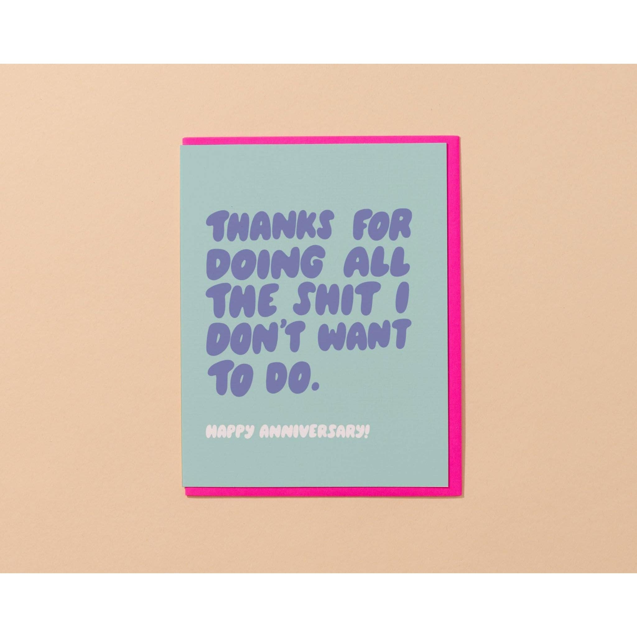 “Thanks for doing all the shit I don't want to do. Happy Anniversary" We all have our strengths and if you can find someone to do the things that you don't want to do, well, that definitely deserves a card at the very least.