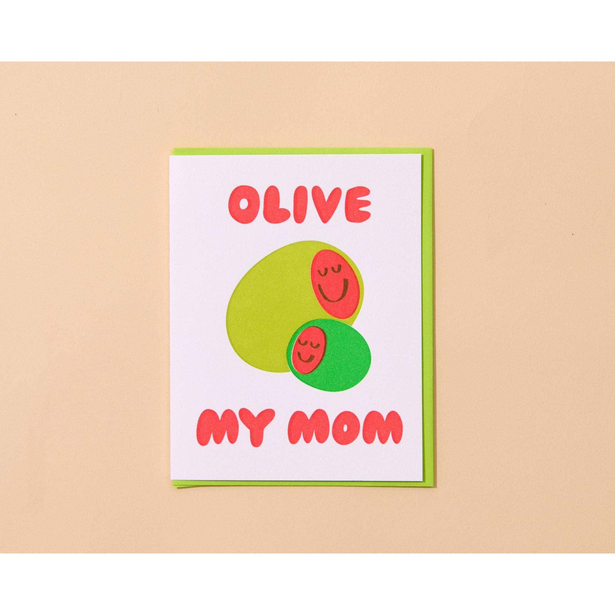 "Olive [love] My Mom" with an illustration of a two smiling, snuggling olives.