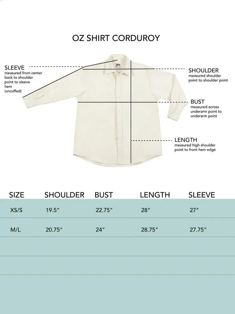 The Oz is an oversized shacket with our fit tweaks. The body is 90s oversized, with dropped shoulders and roomy, bracelet length sleeves. Side seam pockets at the hem and two front chest pockets, with deep pleats at back yoke and at the cuffs.