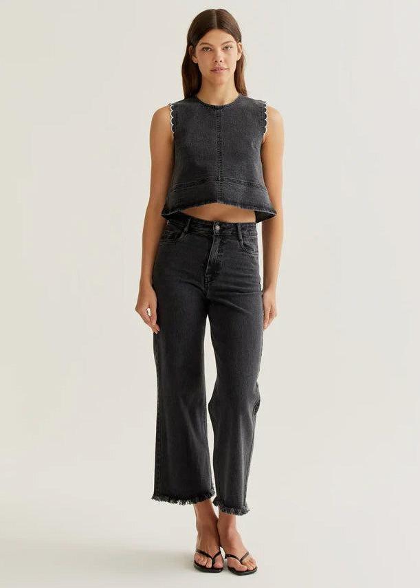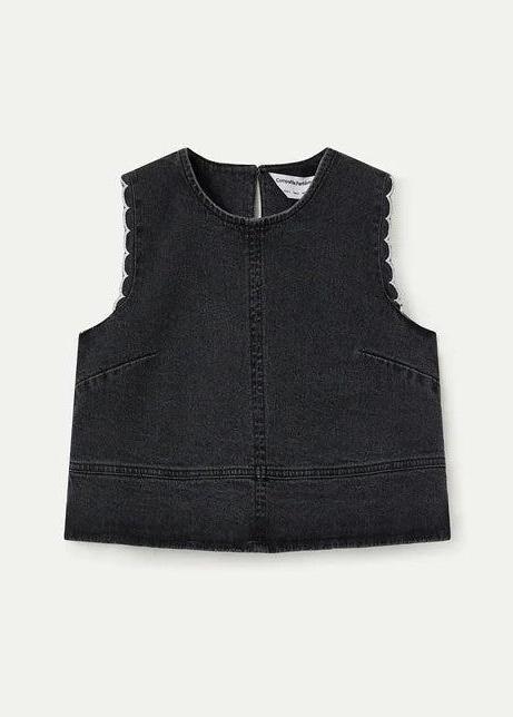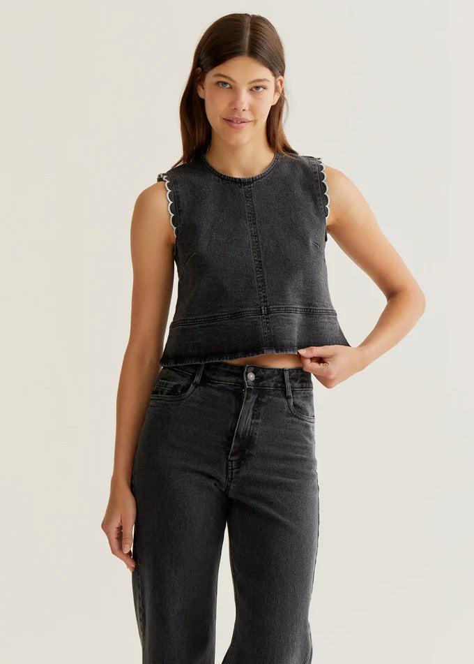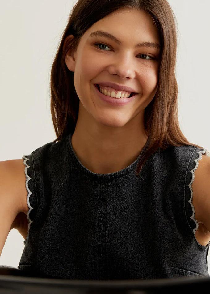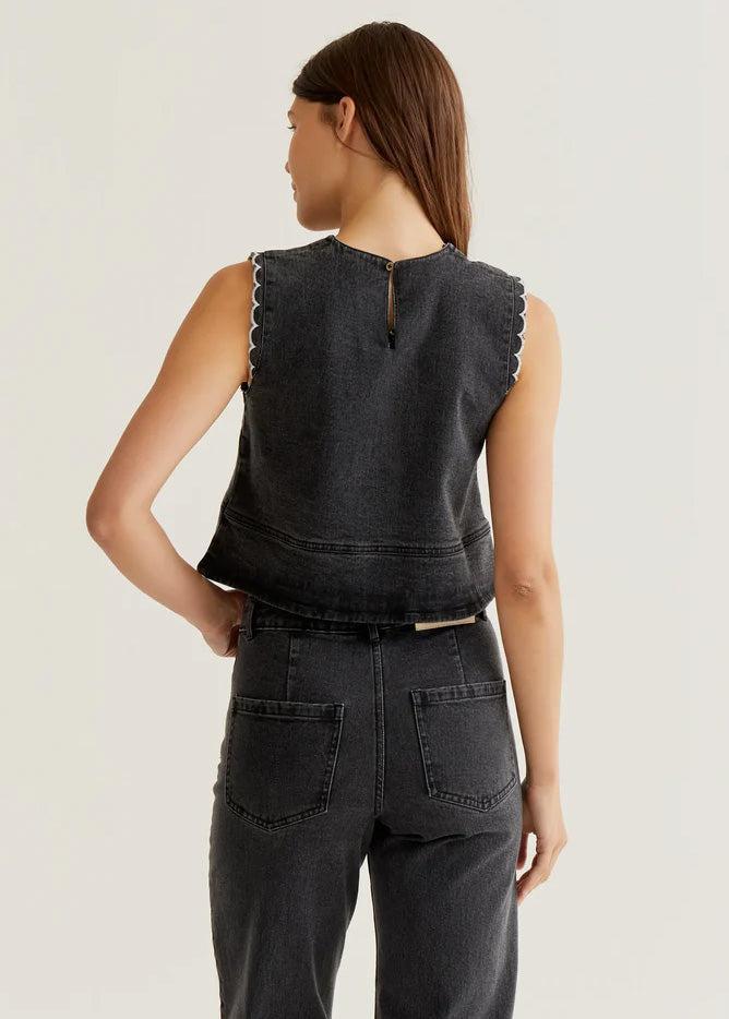 We love the wavy white detail at the shoulders of this faded black denim top. Round neck and sleeveless. Button closure at the back. Pair with matching top for an effortless casual outfit.