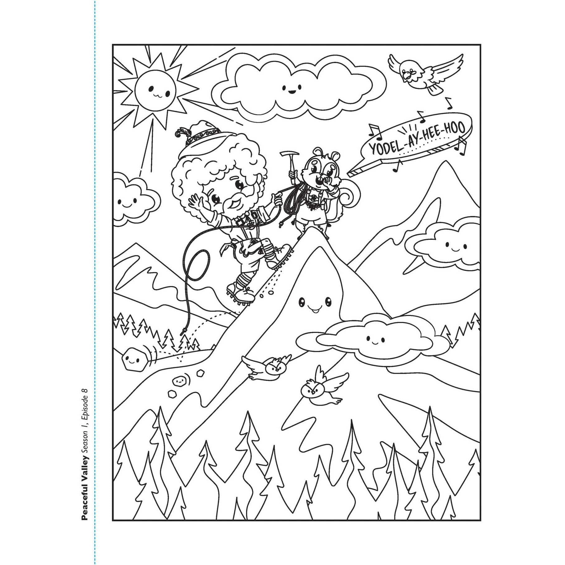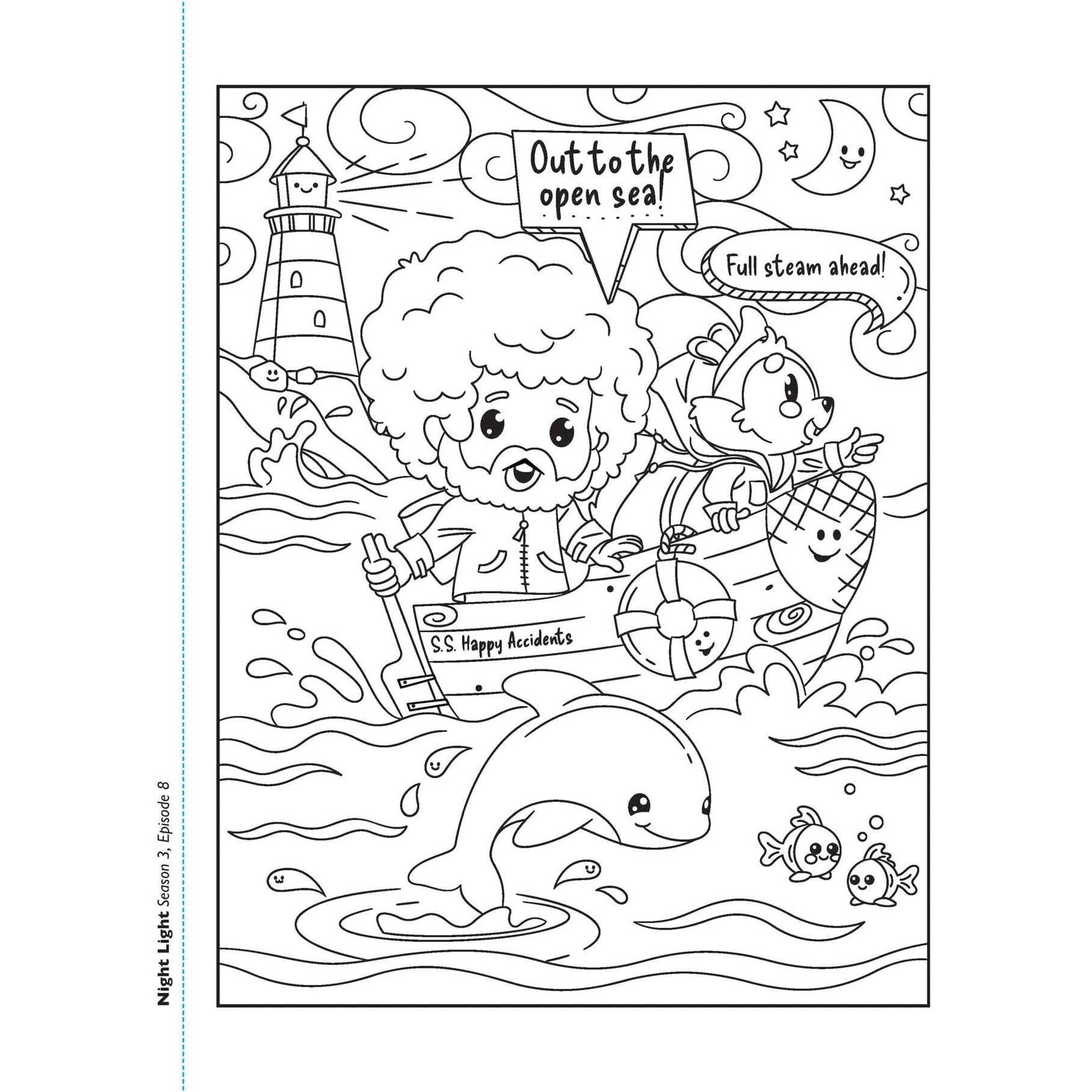 Color in 70 kawaii-style scenes featuring Bob Ross living and playing inside his famous paintings!