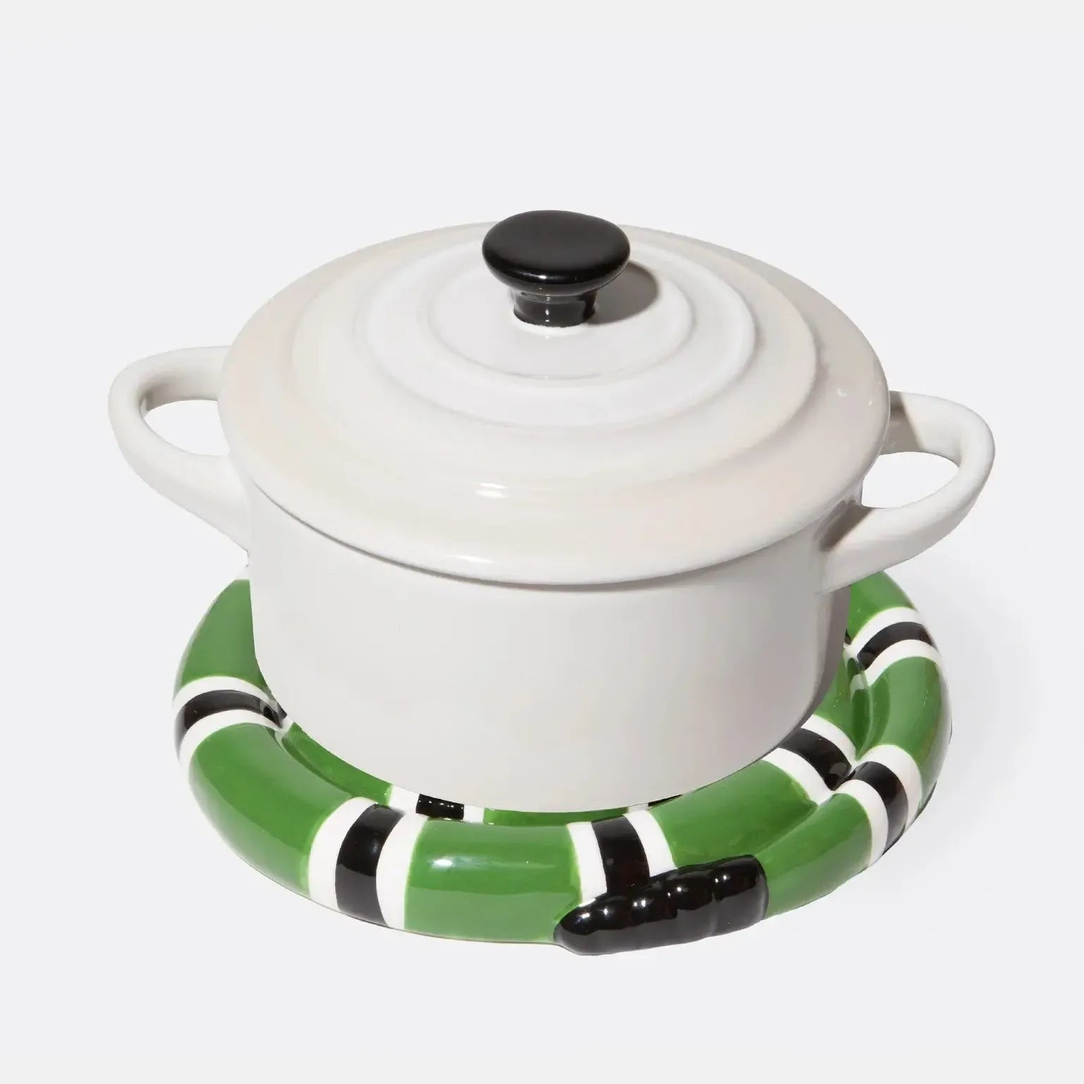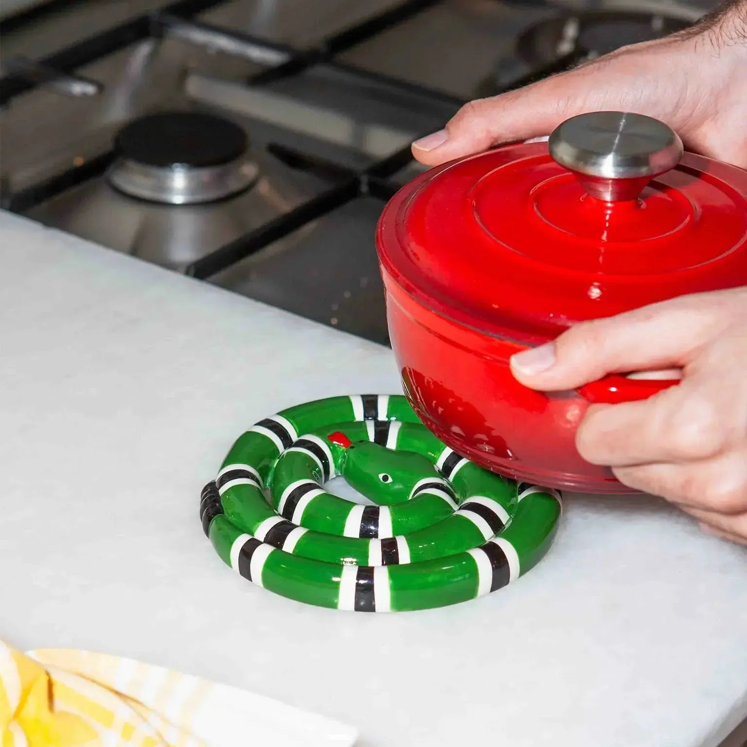 Protect your surfaces with a serpentine twist. This green snake trivet is bold, fun, and totally unexpected.
