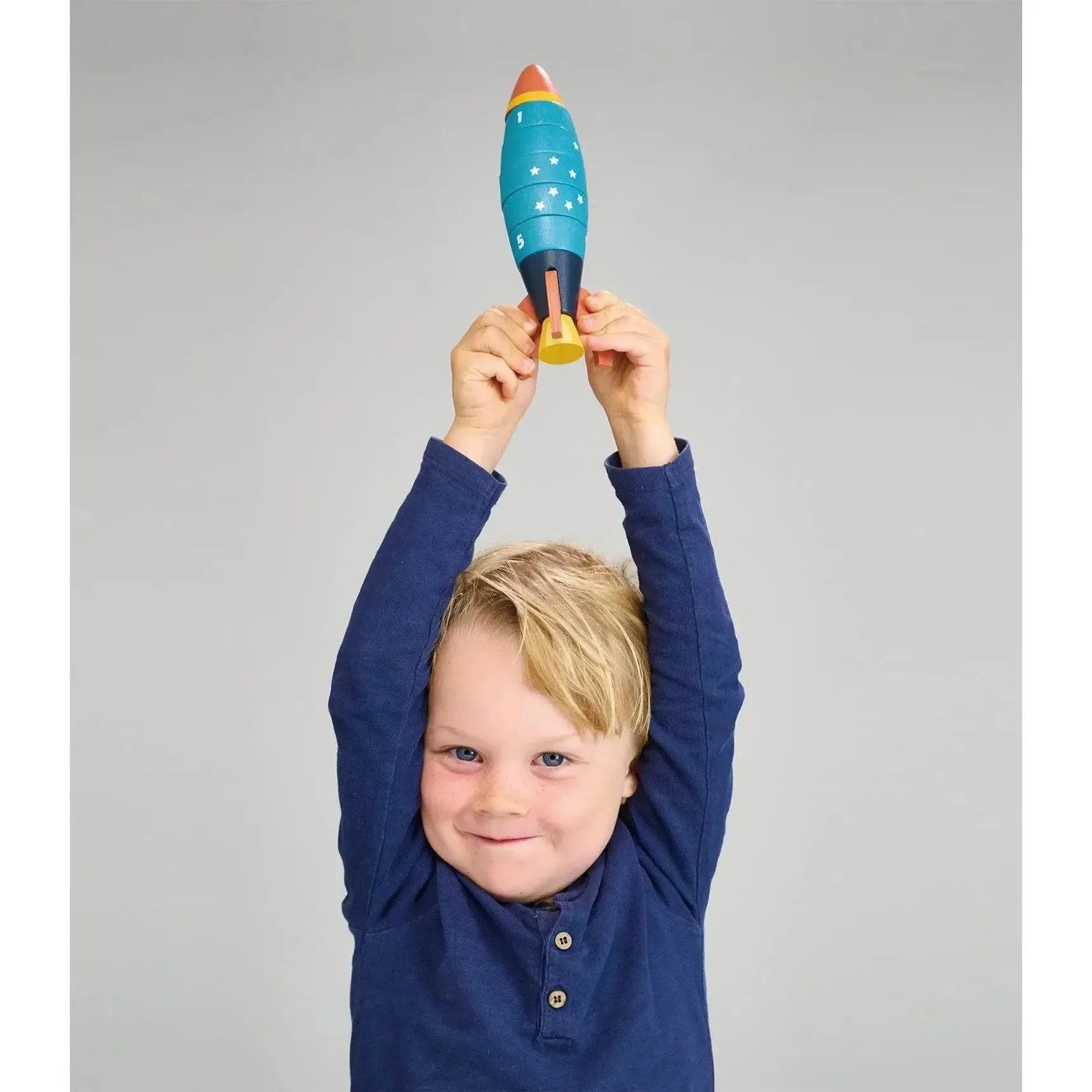 A classic stacking ring toy that involves both stacking and shape matching pieces in the correct order to form a colourful rocket. If assembled correctly, the numbers will read 5, 4, 3, 2, 1 from the bottom up, and each ring has the corresponding number of stars printed on the back.