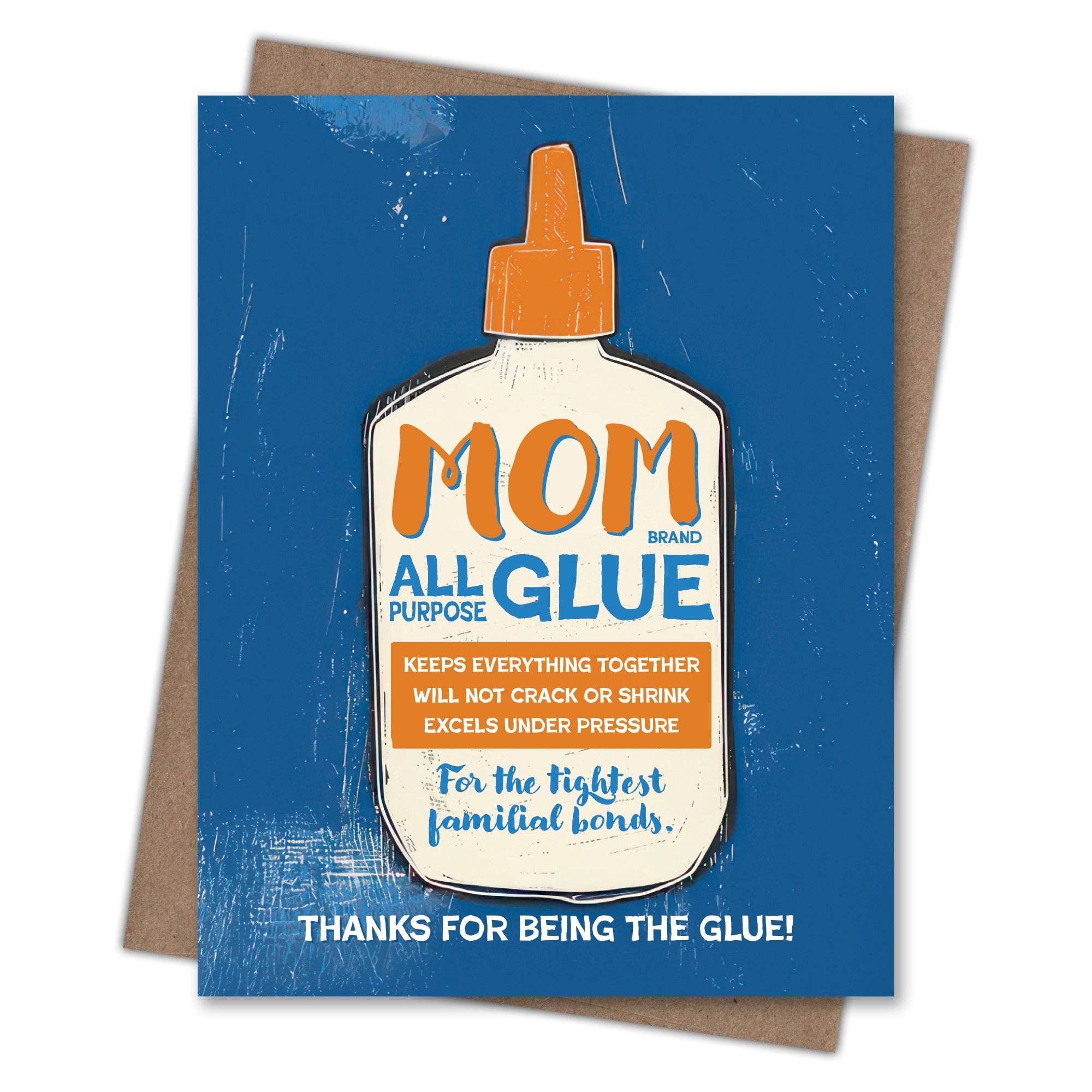 An iconic glue bottle labeled with all the ways moms hold everything together makes this a clever and heartfelt Mother's Day tribute to the all purpose love of mothers. Printed on 100 percent recycled paper because we love trees as much as we love helping you connect. Blank inside so you can write whatever you want. Comes with a recycled kraft envelope so the whole thing is easy on the eyes and the earth.