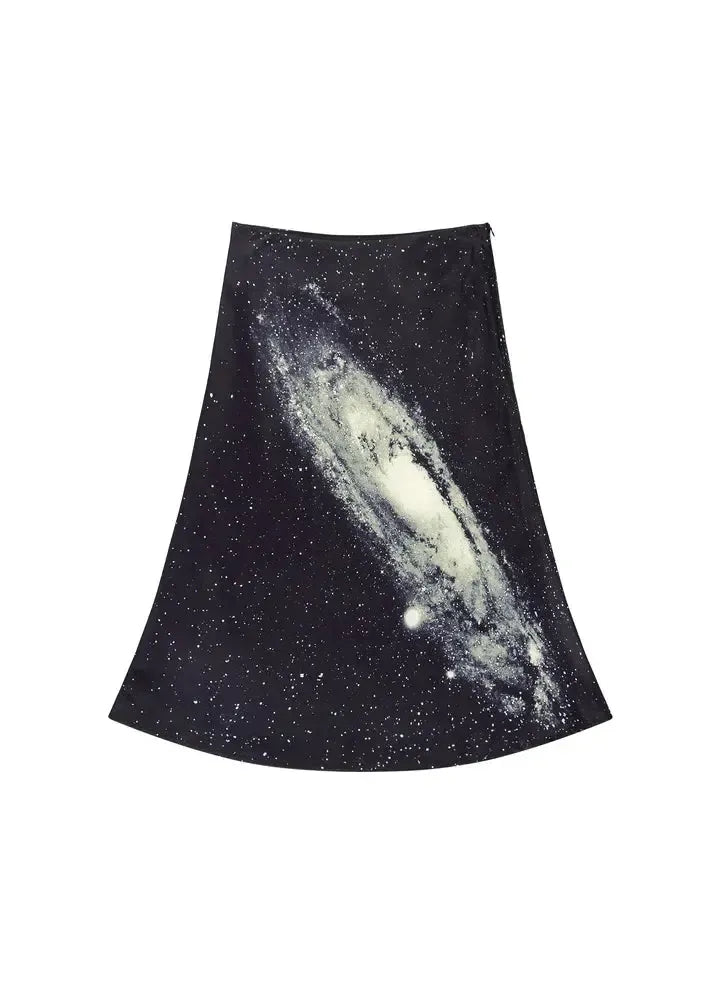 From the Celestial Bodies collection, a galaxy scattered across fluid satin cut into a softly flowing skirt.