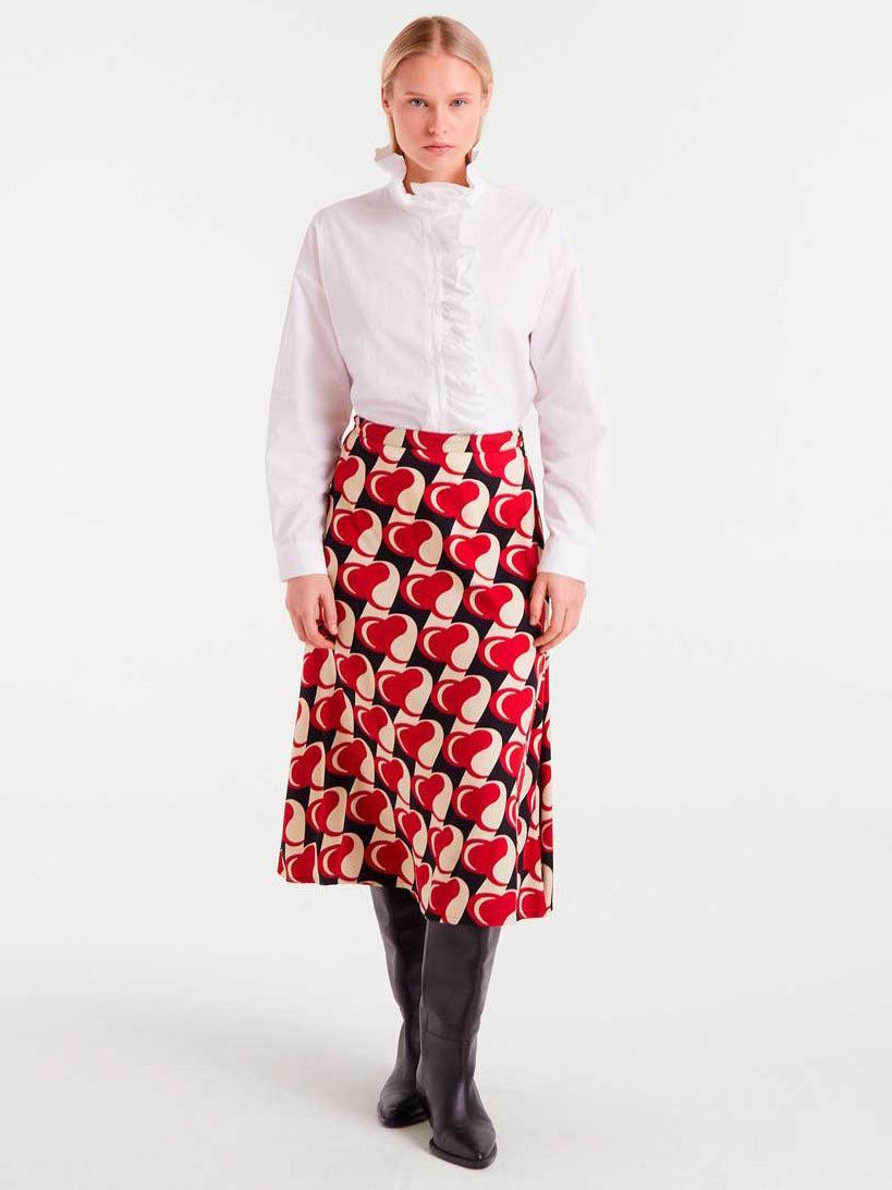 This cotton shirt features a ruffled front and neckline, giving a fun, upscale take on a vintage tuxedo top.