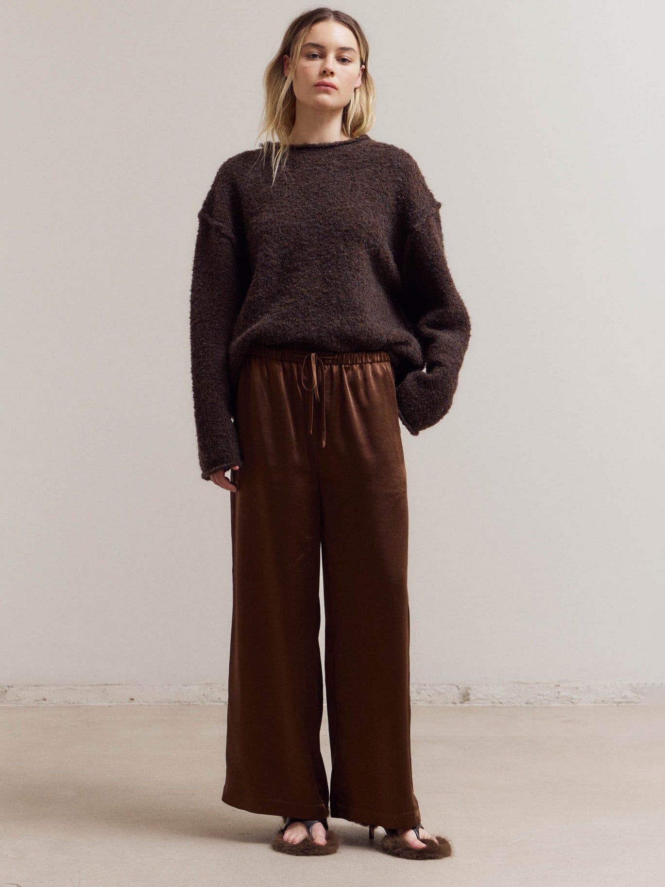 Slip into pure decadence with these luscious wide-leg satin pants in dark chocolate. The plush, substantial fabric drapes beautifully while the elastic banding waist keeps things comfy and chic. Whether you're channeling old-school glamour or just want to feel fabulous, these pants deliver sophistication with a wink. A wardrobe essential that's anything but boring.