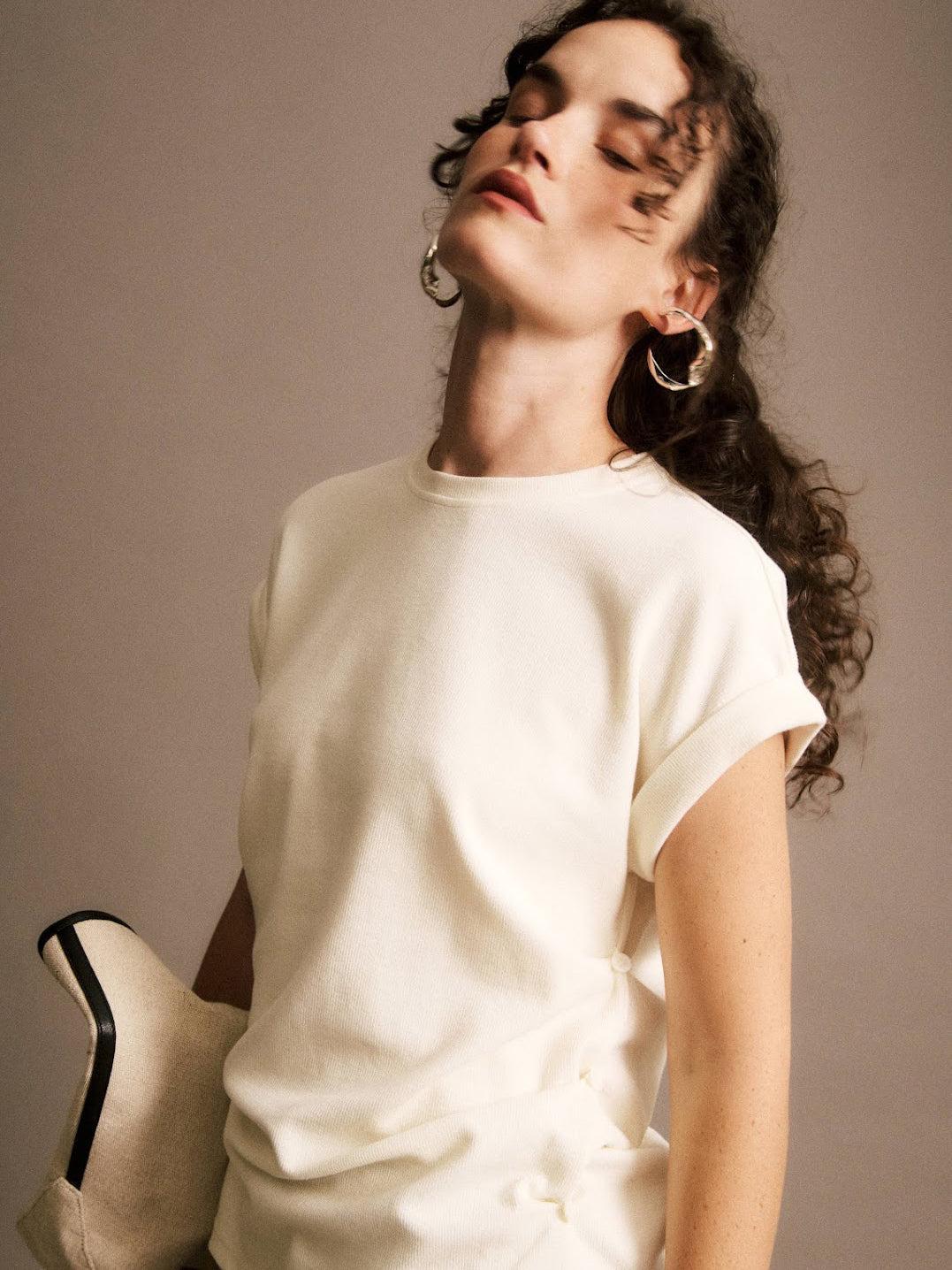 This T is anything but basic. Loads of the special details we love from Jiji Studio. RIbbed fabric, classic T-shirt neckline, cap/cuffed sleeves and side gathers with buttons (you can unbutton them to customize your look).