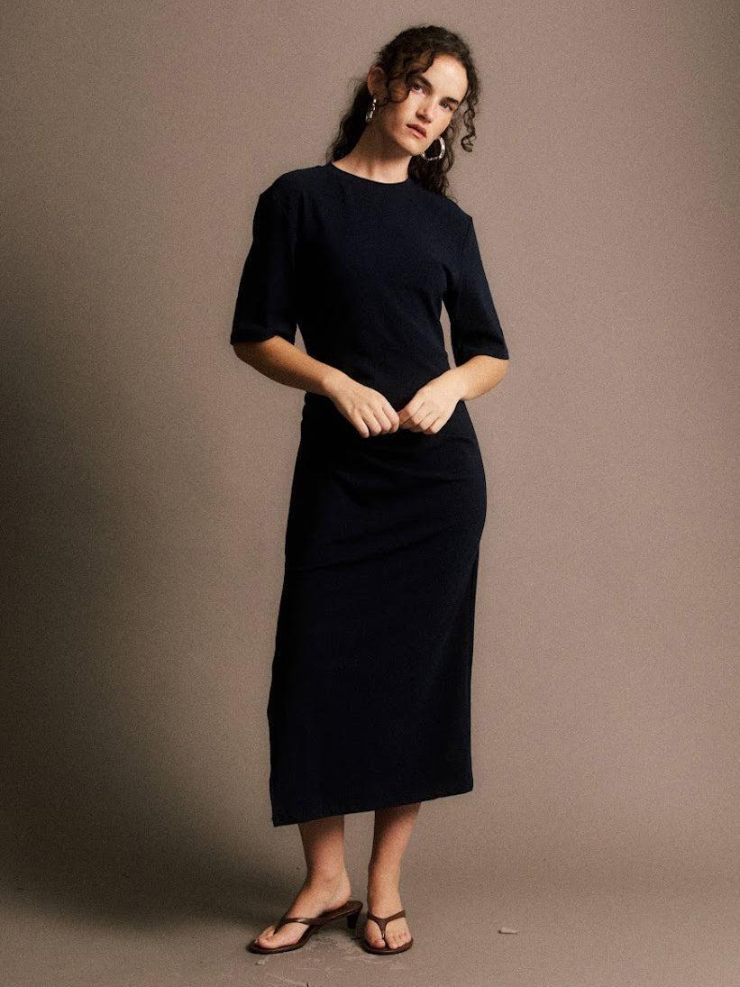 Leave it to the French to make a T-shirt dress sexy. Fitted and shirred on one side for a flattering drape. 3/4 sleeves and a side slit.