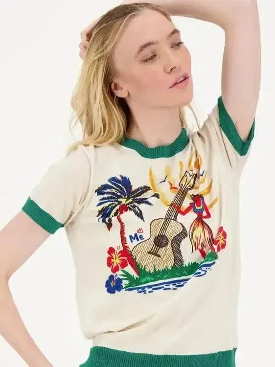 LOVE this sweater from a new brand for us...Me369. These retro inspired sweaters rock. Short sleeves with contrast ribbed hem and sleeve.