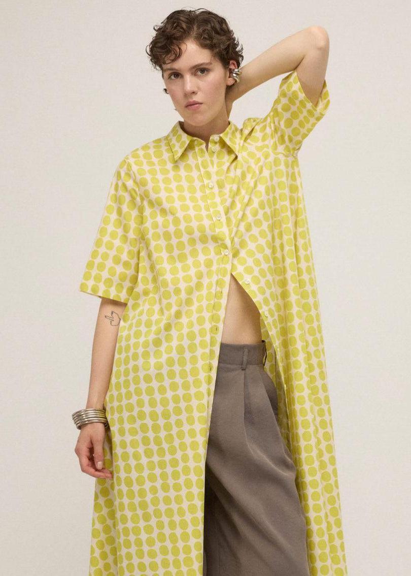 Effortless style meets everyday comfort in this midi shirt dress featuring an all-over citrine polka dot print. Crafted from 100% smooth cotton, it drapes beautifully while keeping you cool and comfortable. Practical pockets add functionality to this versatile piece that transitions seamlessly from casual outings to relaxed gatherings.