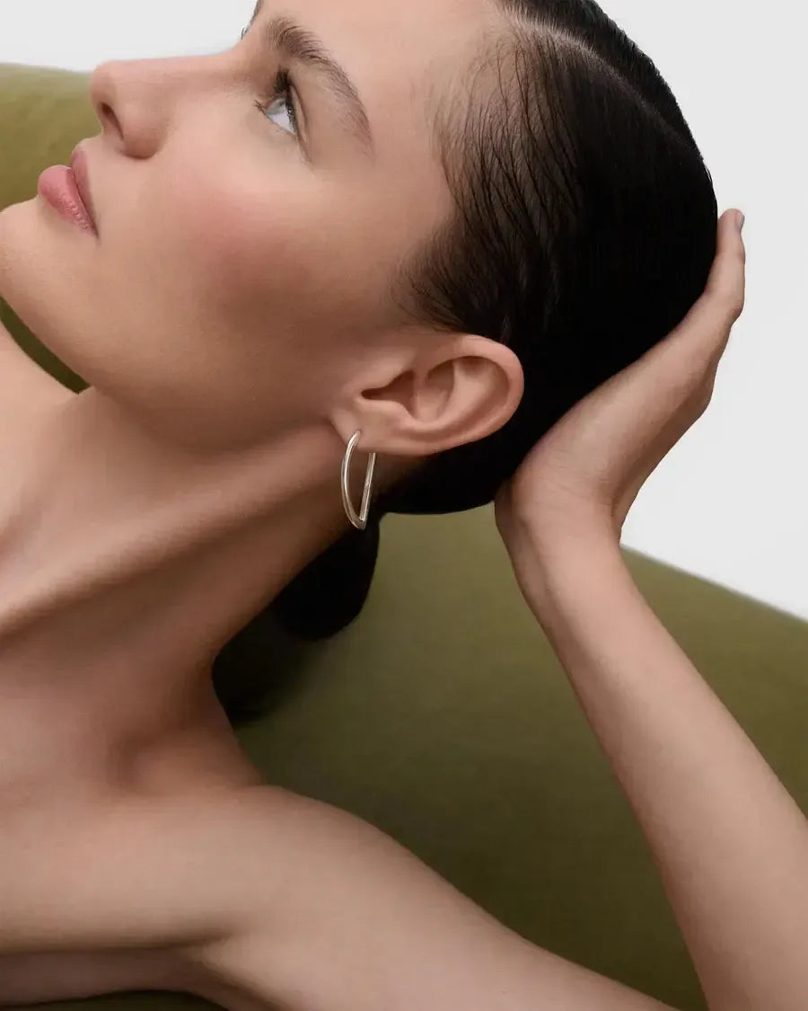 We're in love with our newest brand, PDPAOLA. Designed in Barcelona with architectural influences, they're fabulous! Try these large silver geometric hoop earrings with asymmetric oval shape.
